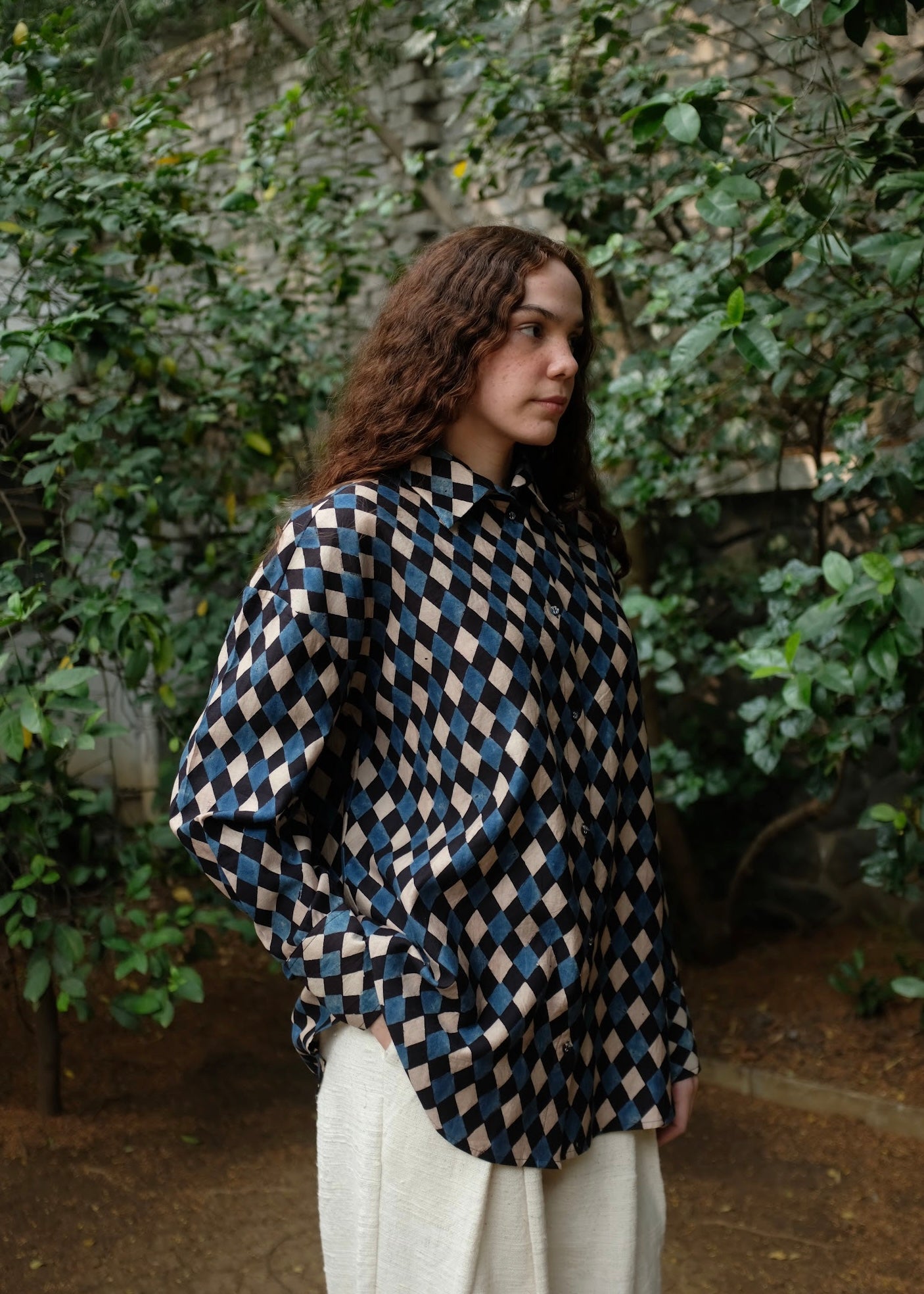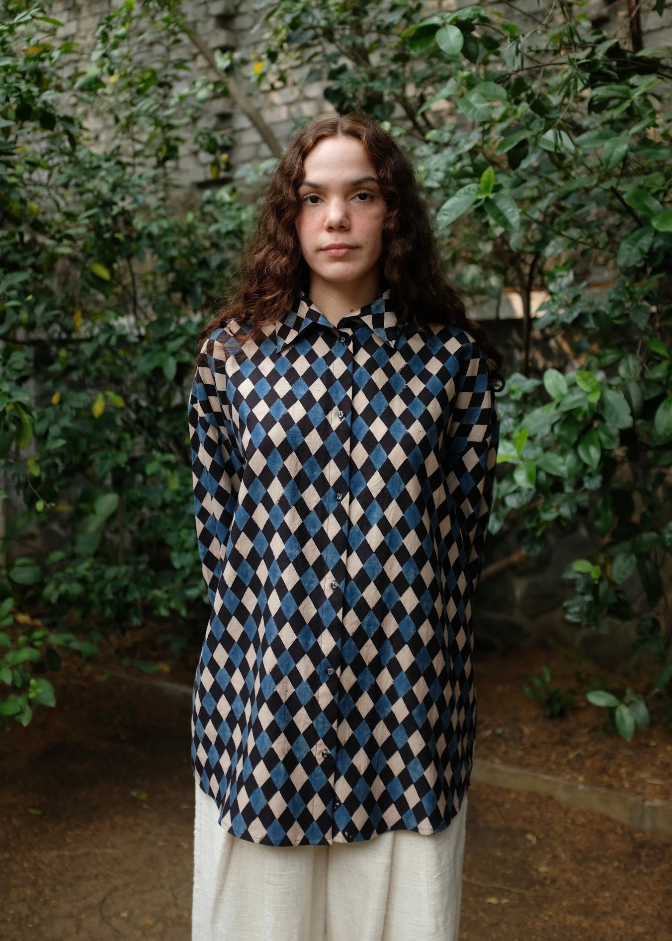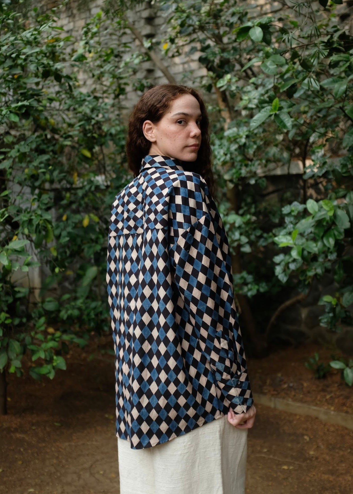 Handwoven in Bengal and hand block printed in Kutch, this cotton silk textile with a geometric Ajrakh print using 100% natural dyes is the coming together of crafts from East to West. Oversized button-down shirt with wide cuffs and a relaxed fit. - Blend of handwoven Mulberry Silk and Cotton - Hand-printed Ajrakh - Printed using natural dyes SM chest - 50" L/XL chest -54" Length - 29" The model is 175cm tall, and measures 32 inches around her chest, wearing SM Our dispatch timeline is 8-10 business days. |