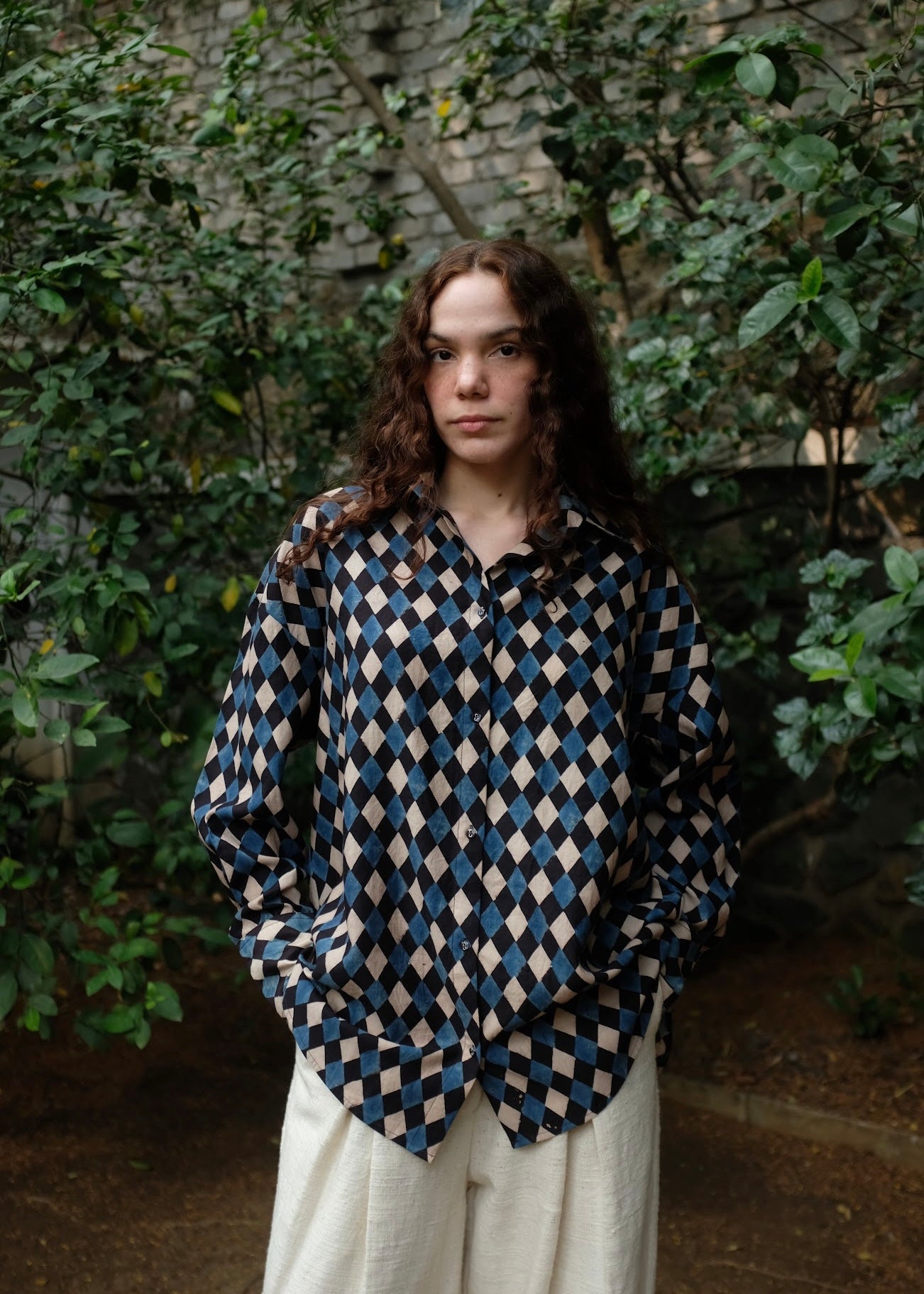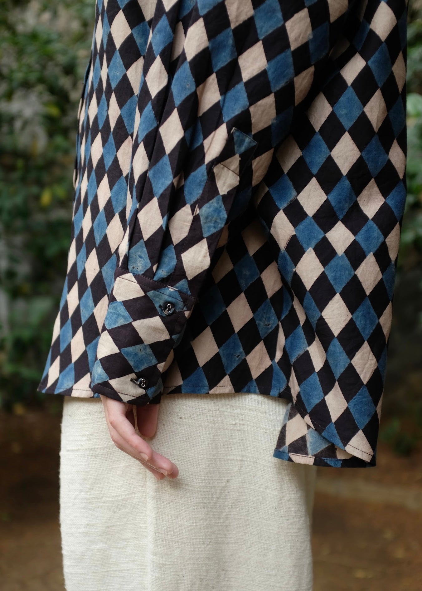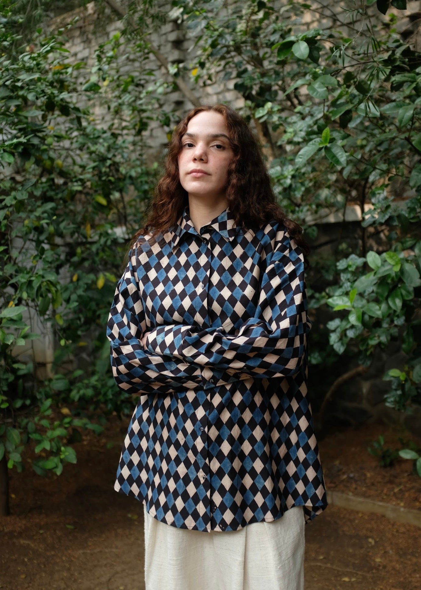 Handwoven in Bengal and hand block printed in Kutch, this cotton silk textile with a geometric Ajrakh print using 100% natural dyes is the coming together of crafts from East to West. Oversized button-down shirt with wide cuffs and a relaxed fit. - Blend of handwoven Mulberry Silk and Cotton - Hand-printed Ajrakh - Printed using natural dyes SM chest - 50" L/XL chest -54" Length - 29" The model is 175cm tall, and measures 32 inches around her chest, wearing SM Our dispatch timeline is 8-10 business days. |