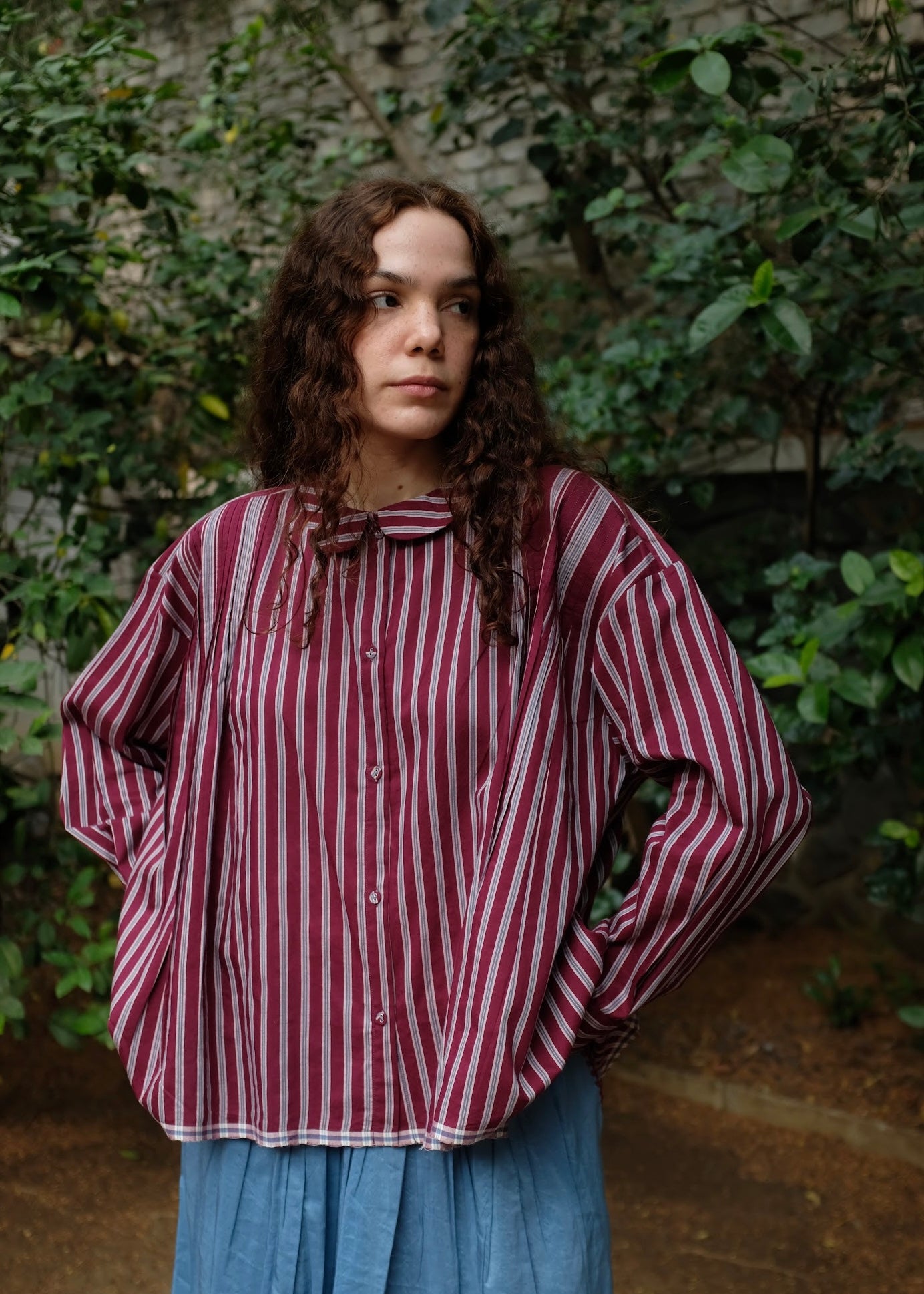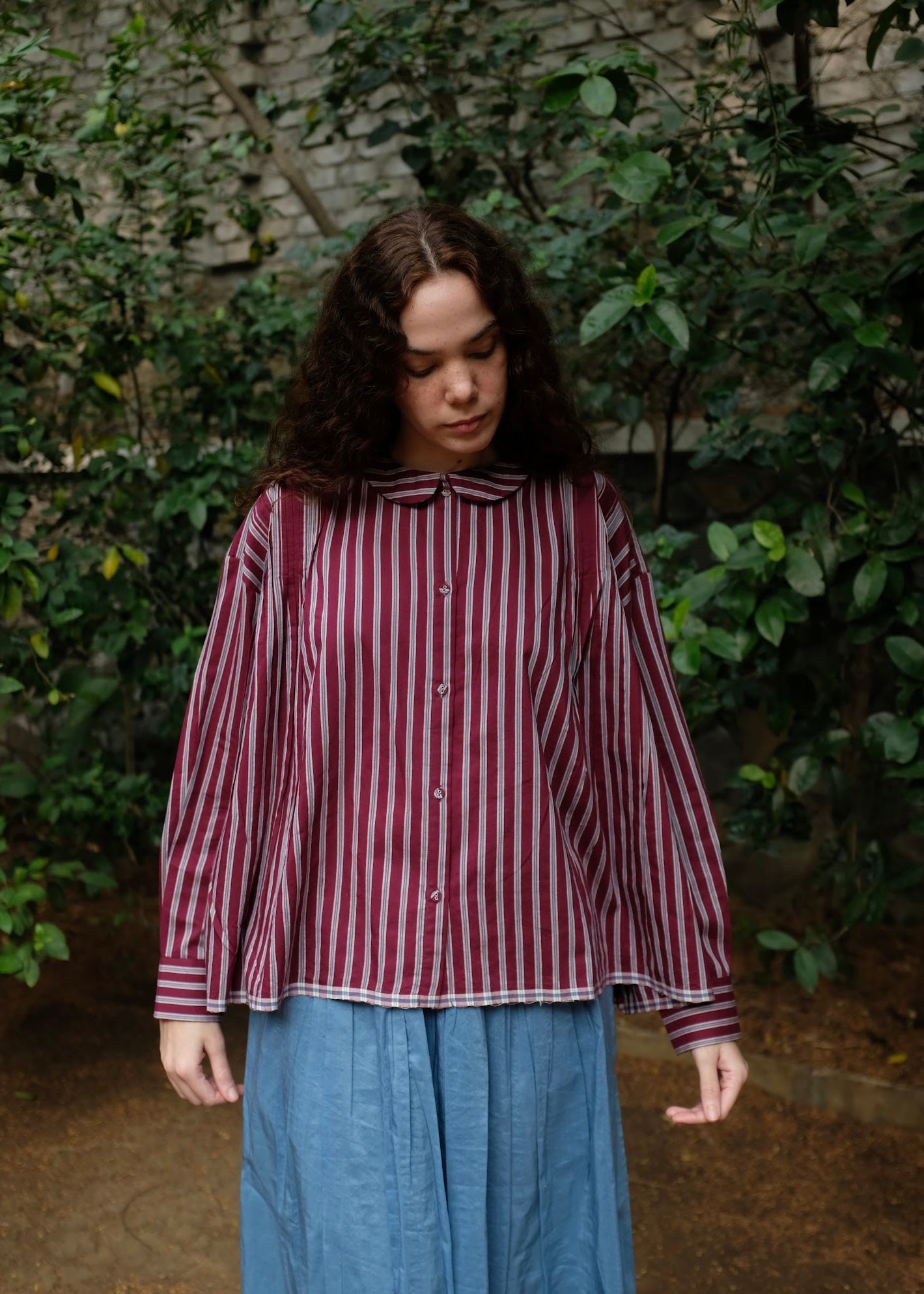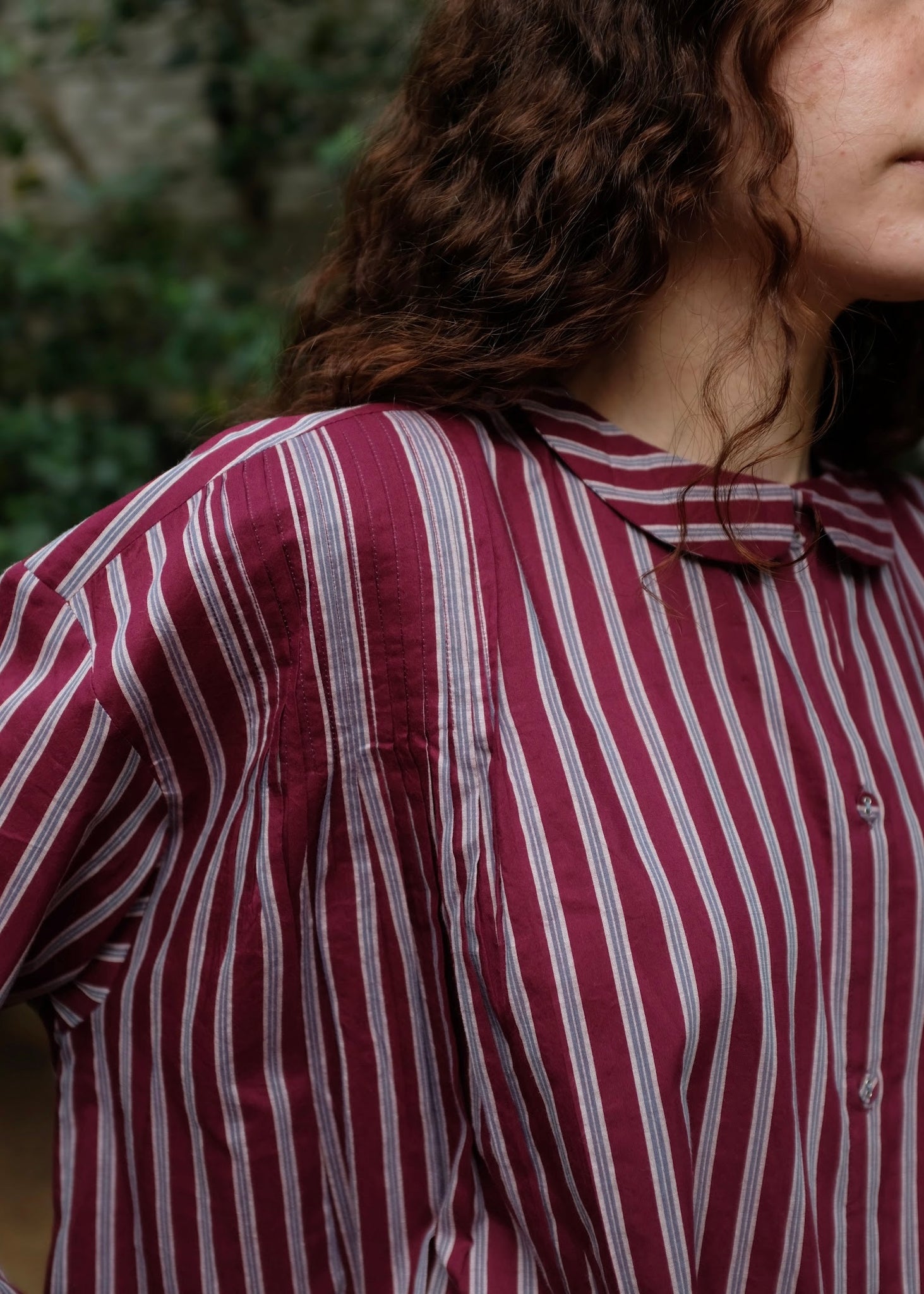 A garment defined with a playful peter pan collar and fine knife pleats at the shoulder that bring lightness and movement. Crafted in handwoven cotton–silk fabric with rich wine stripes, it is finished with a contrasting selvedge detail, adding a subtle yet distinctive finish to the design.