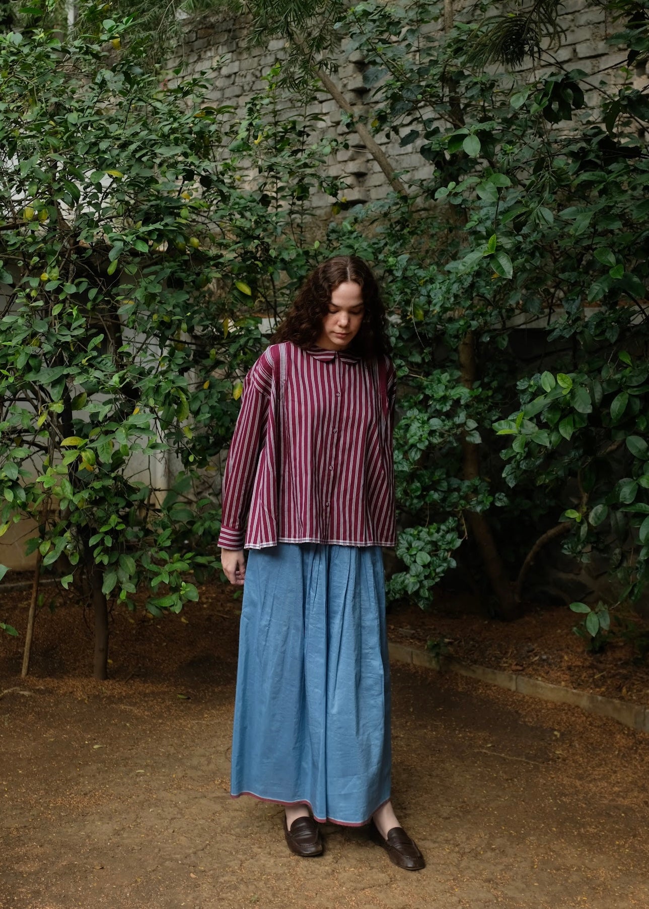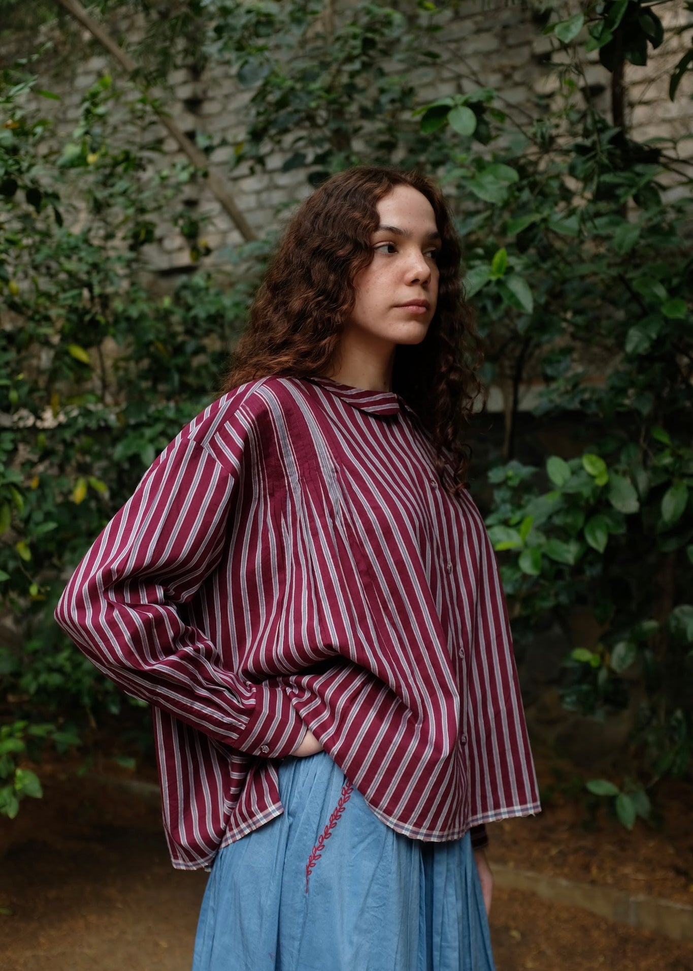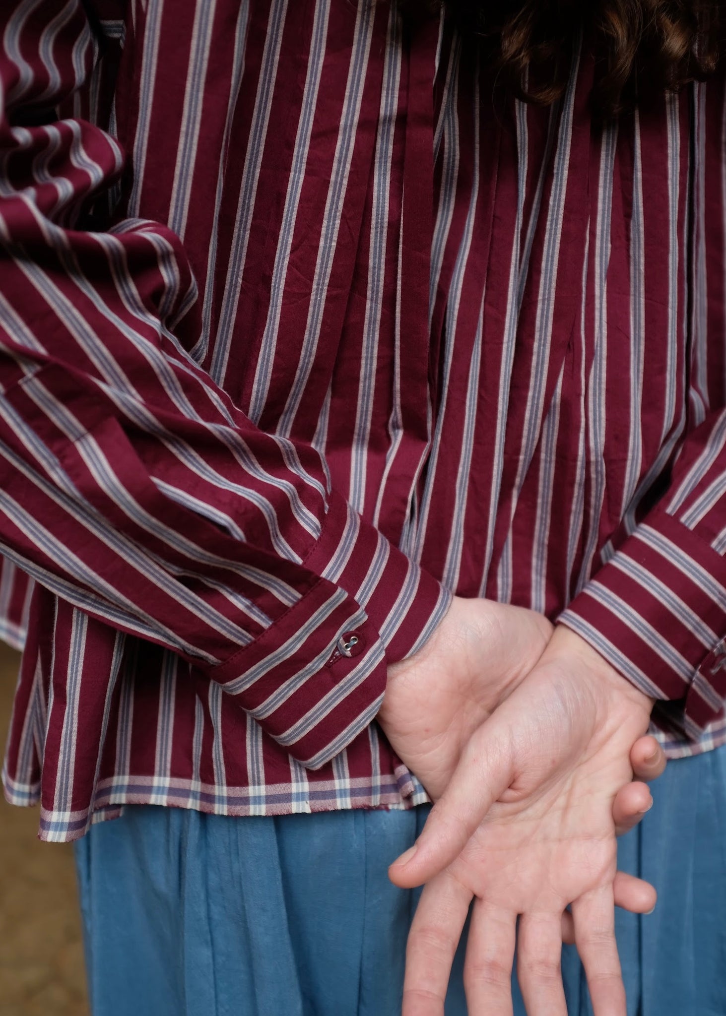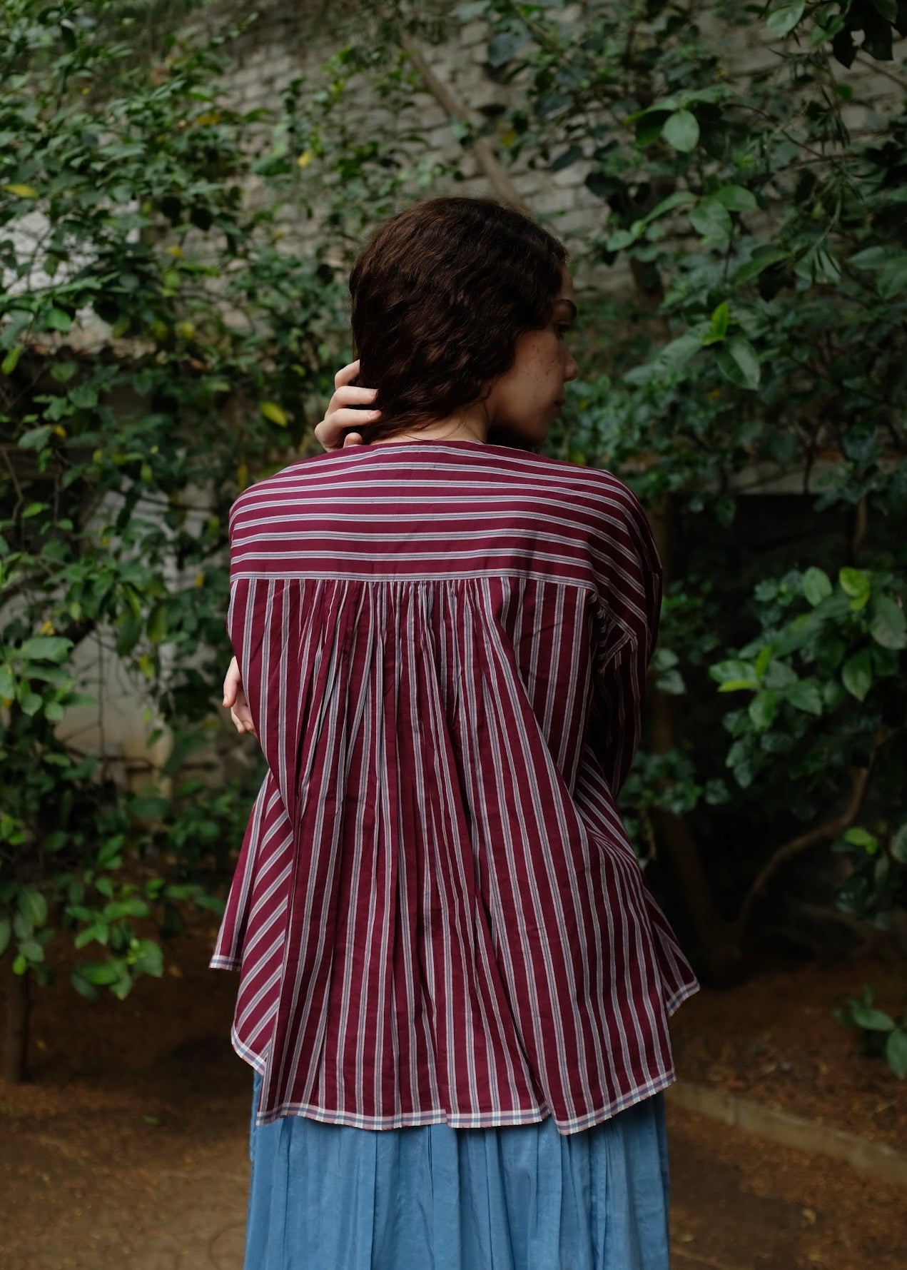A garment defined with a playful peter pan collar and fine knife pleats at the shoulder that bring lightness and movement. Crafted in handwoven cotton–silk fabric with rich wine stripes, it is finished with a contrasting selvedge detail, adding a subtle yet distinctive finish to the design.