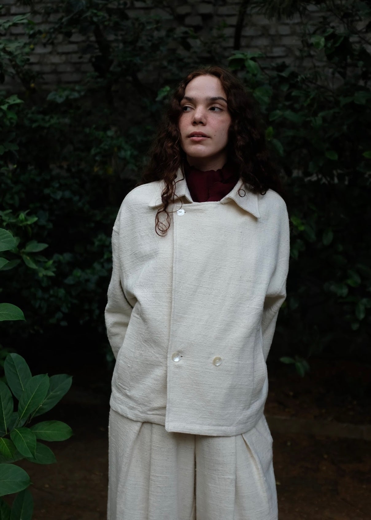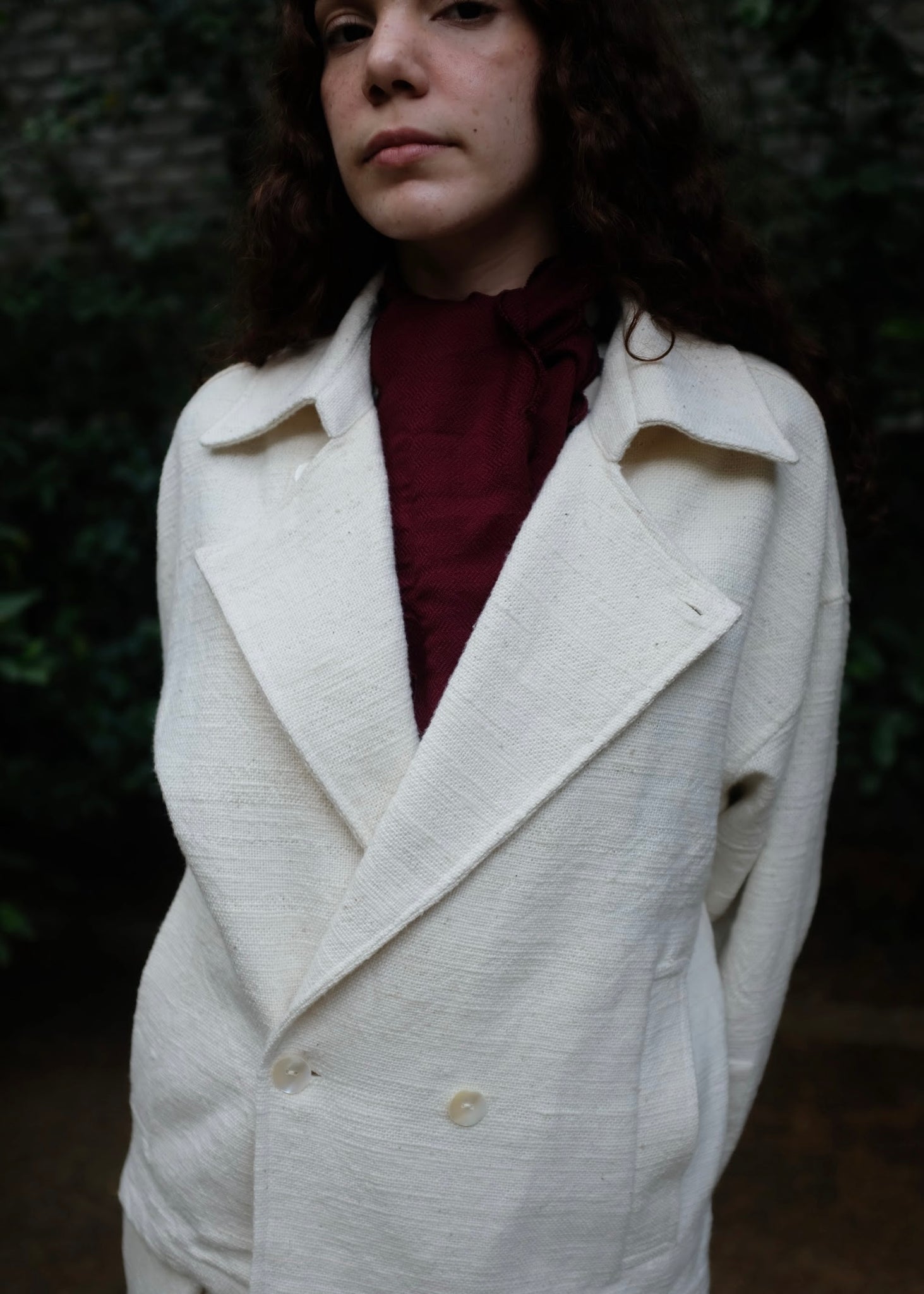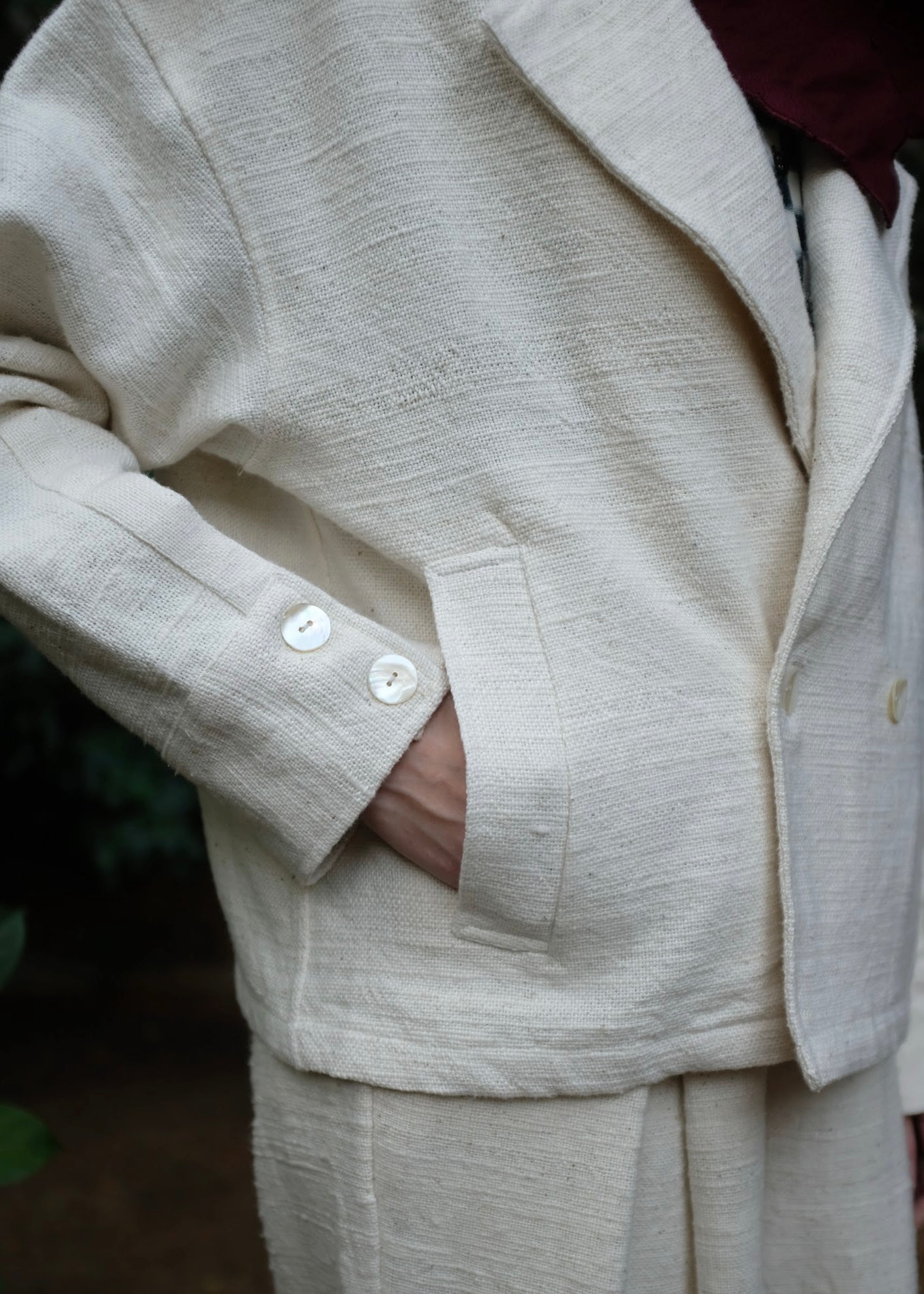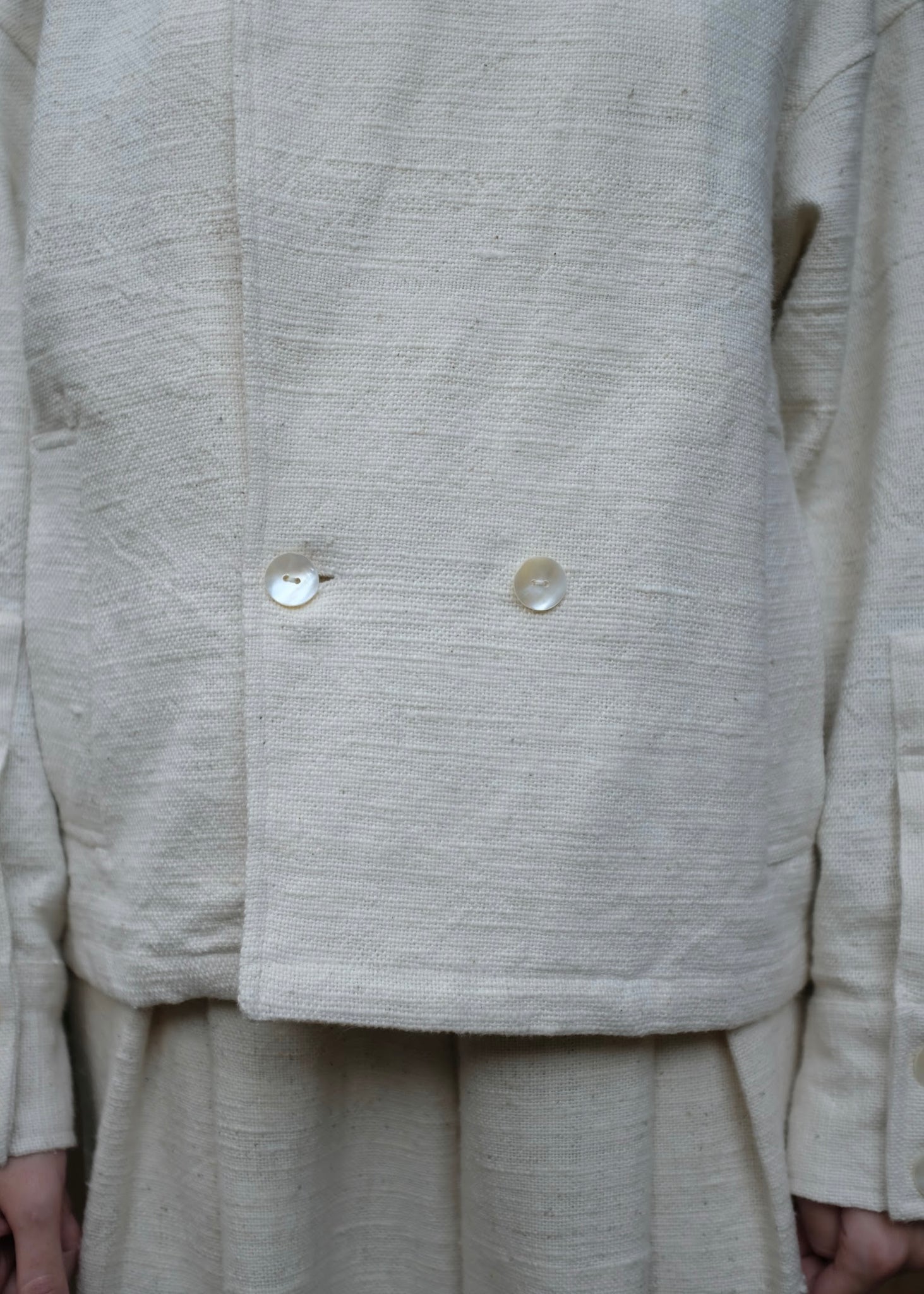 A classic versatile wardrobe staple, this double-breasted oversized jacket is crafted from heavy weight handspun handwoven indigenous cotton, lending it strength, texture, and longevity. Defined by wide and oversized lapels and buttons placed in a manner that allows the coat to be styled in three distinct ways, adapting effortlessly to form and function.