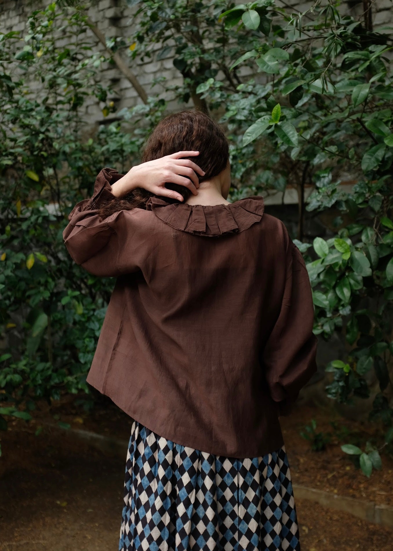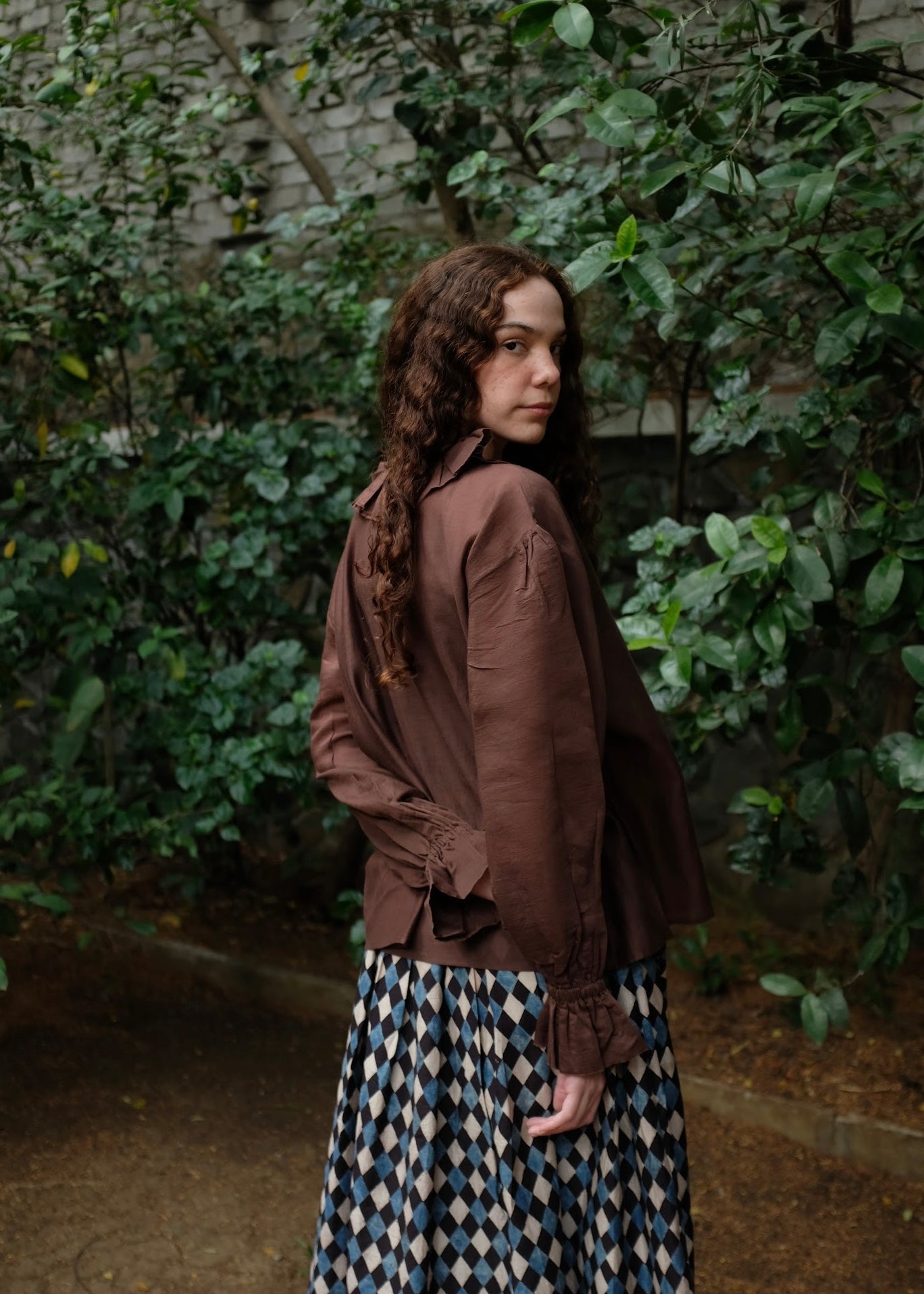 A top crafted from fine handwoven cotton silk, known for its gentle sheerness and lightness. Ruffles trace the neckline and cascade softly down to the placket, creating a sense of movement and ease. The sleeves are gently gathered and finish in elasticated gathers, lending a delicate, feminine silhouette to the garment.
