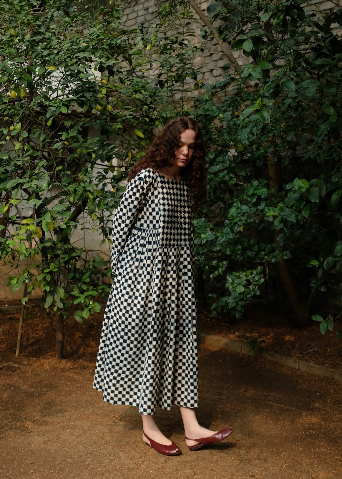 Our classic silhouette is back again with a subtle twist, of knife pleats instead of the usual gathers cut from the softest medium-weight handwoven double Ikat dyed using organic Indigo dye. It is adorned with chic floral embroidery done by hand at the yoke and a small portion of the back.