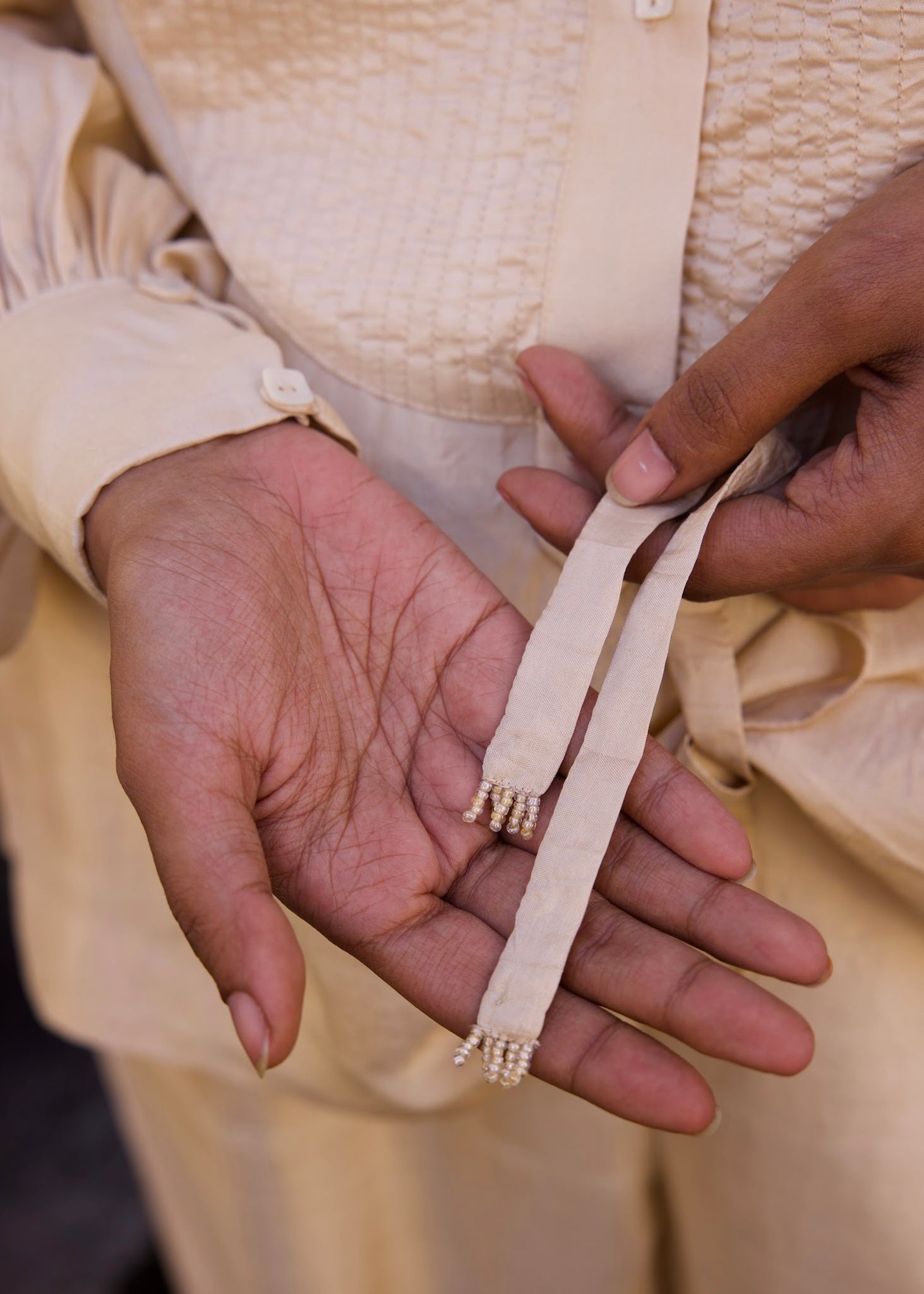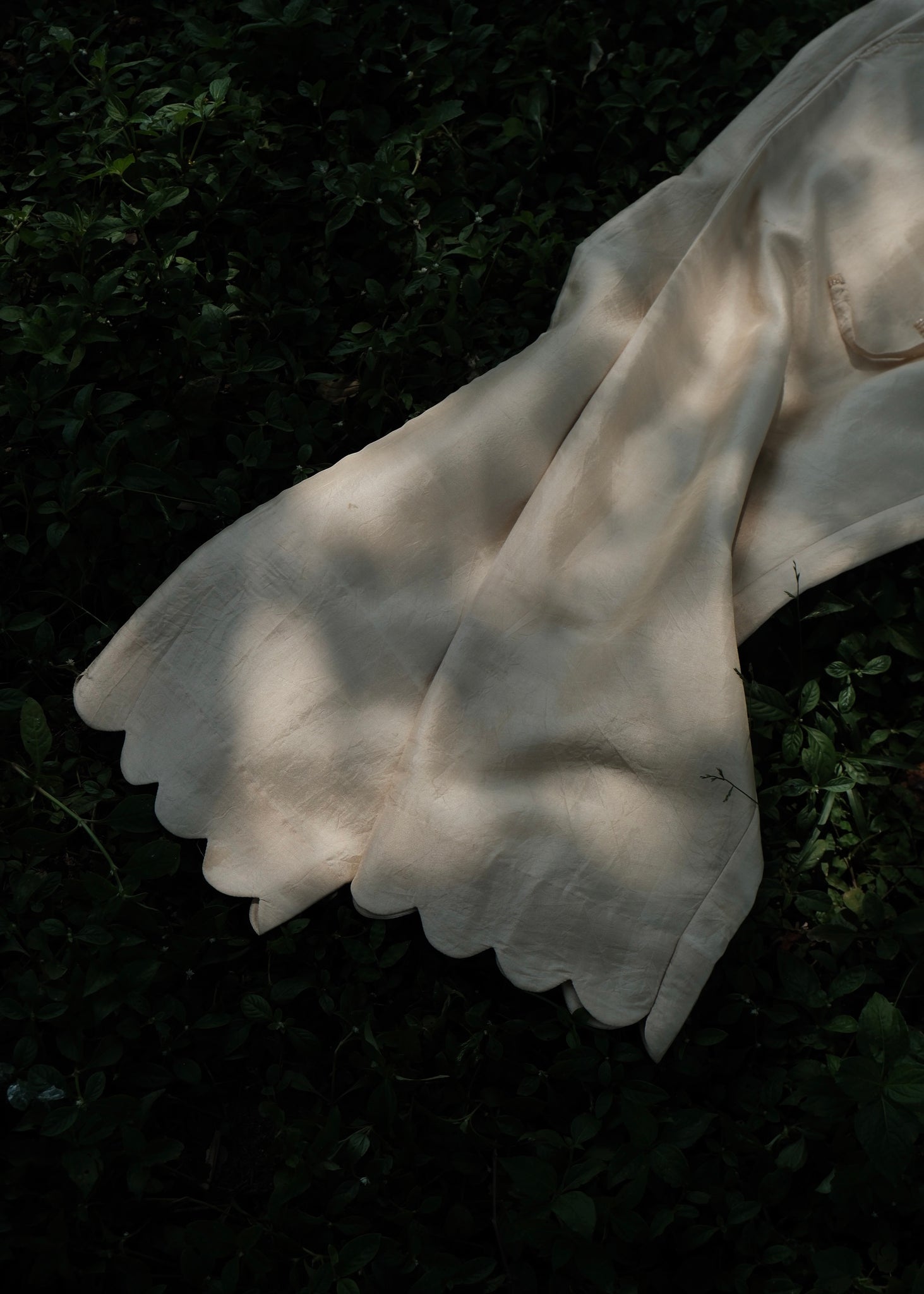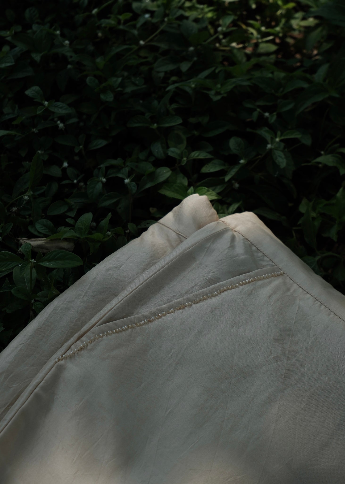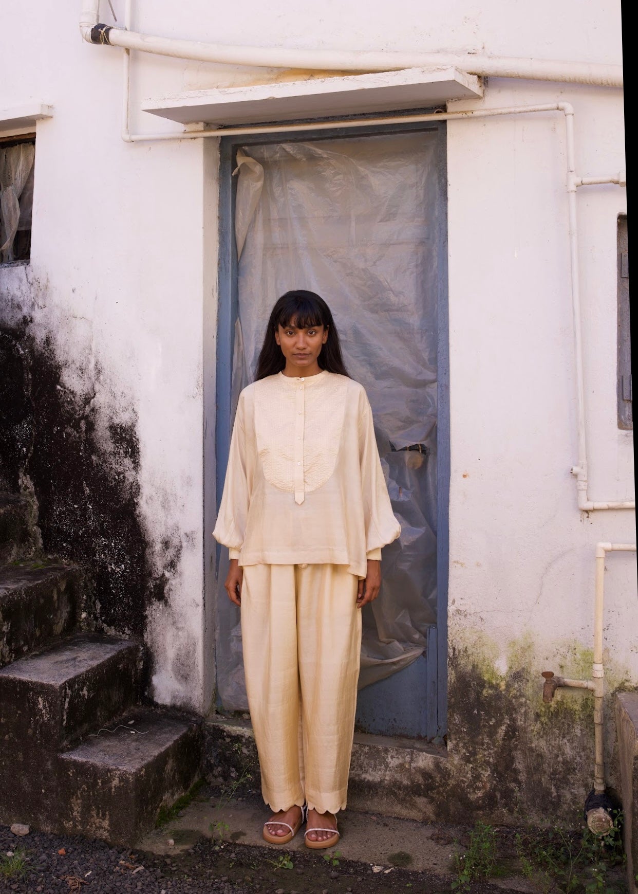 A fresh take on our staple 'Brooke' pants that are simply dressy pyjamas. Oversized but elegantly cut in handwoven mulberry silk, fastened at the waist with a drawstring for a complete comfort fit. The pants are elevated with a scalloped hem and beaded details on the drawstring. These pants comes lined with soft cotton mul.