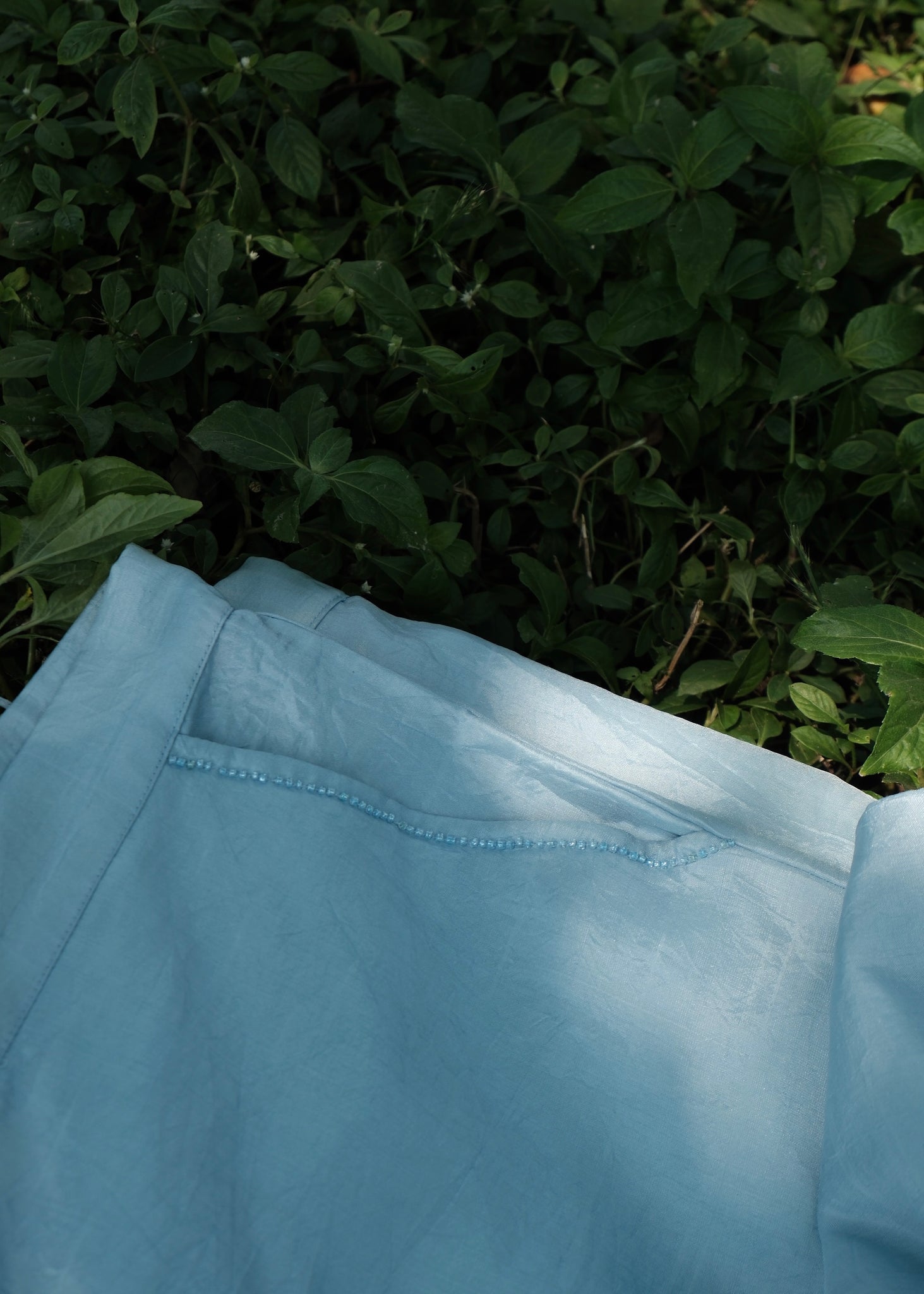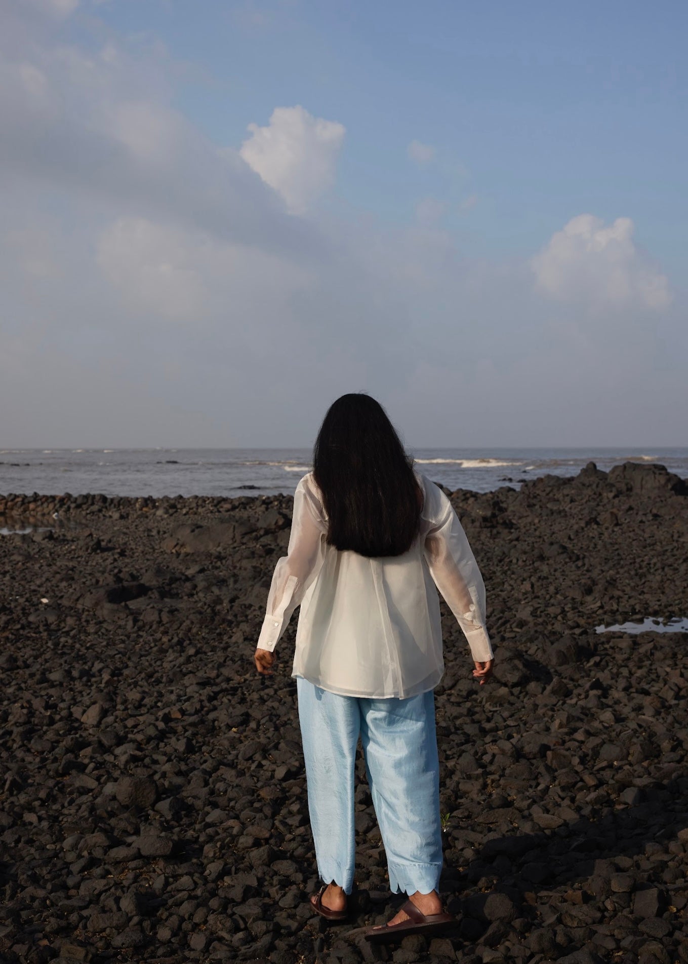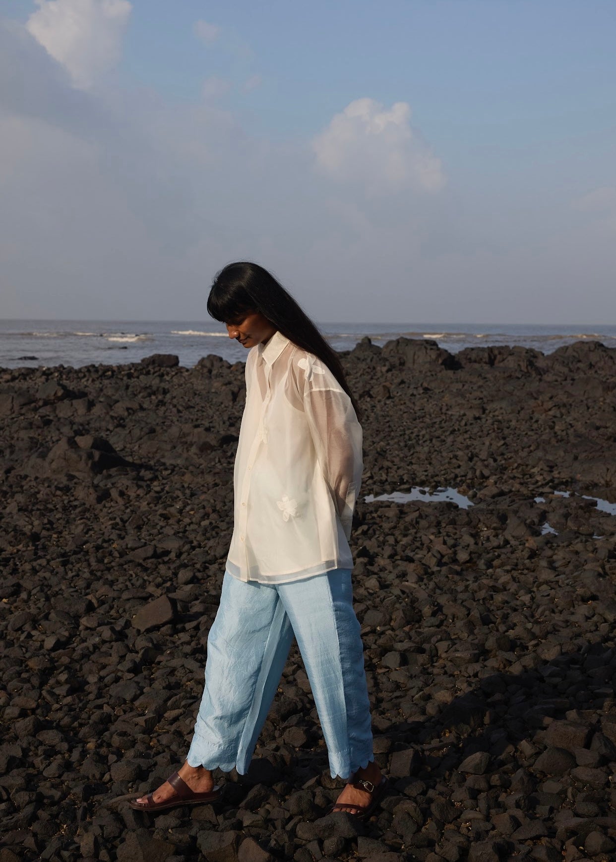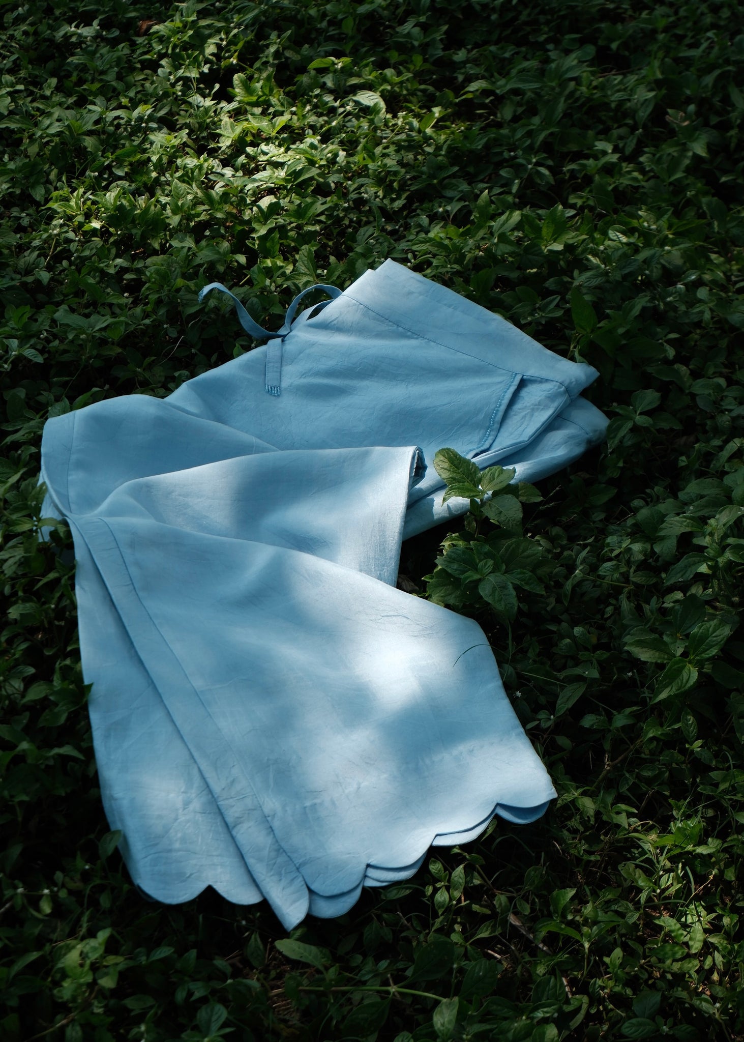 A fresh take on our staple 'Brooke' pants that are simply dressy pyjamas. Oversized but elegantly cut in handwoven mulberry silk, fastened at the waist with a drawstring for a complete comfort fit. The pants are elevated with a scalloped hem and beaded details on the drawstring. These pants comes lined with soft cotton mul.