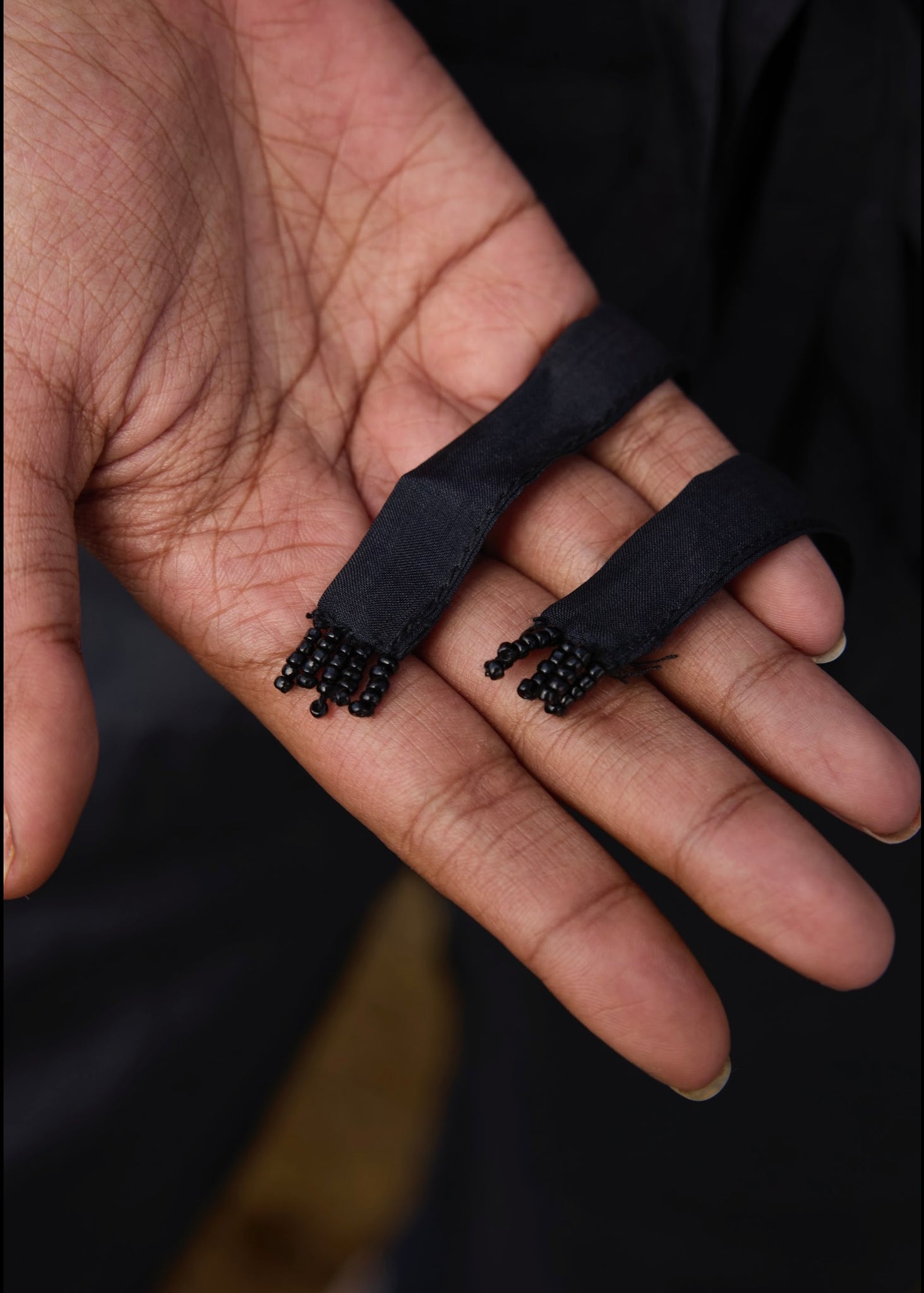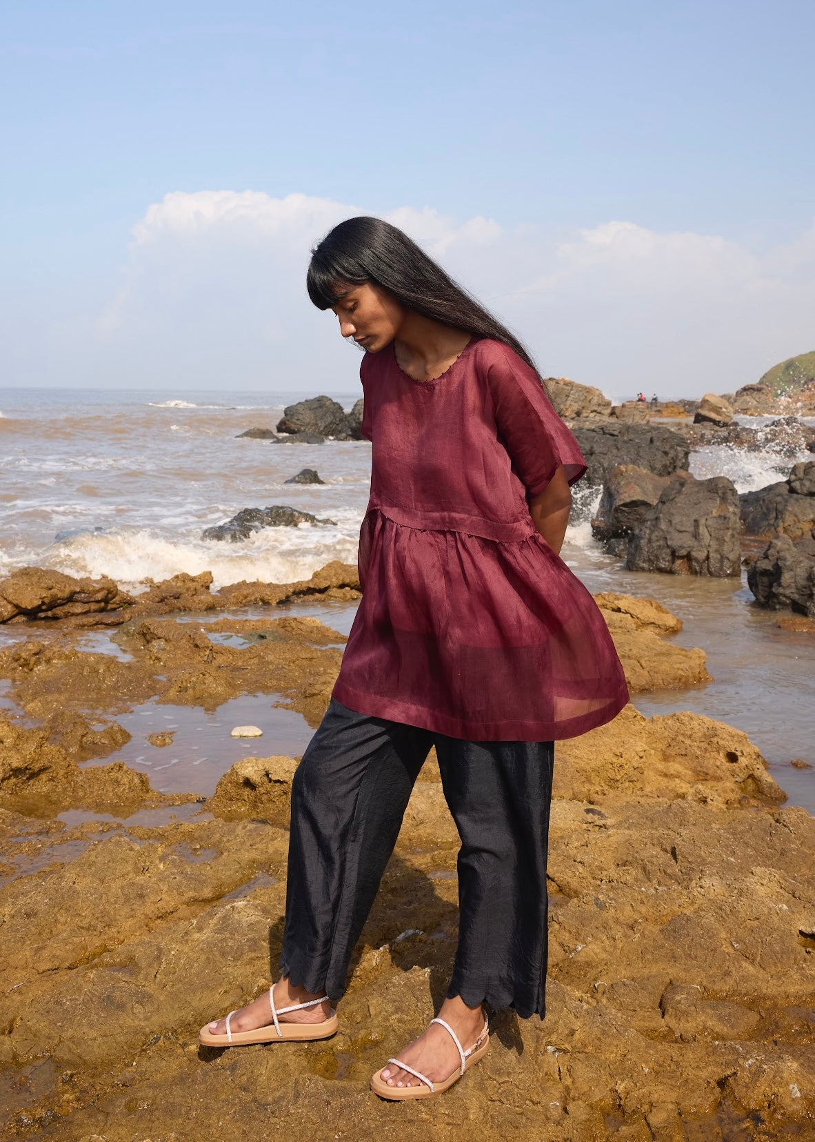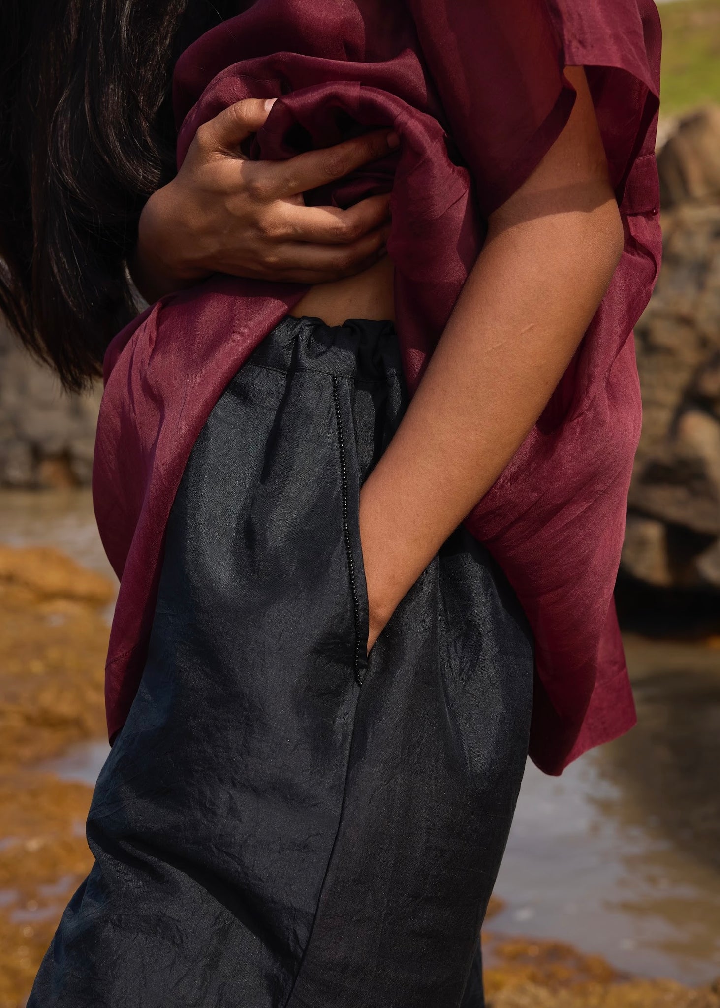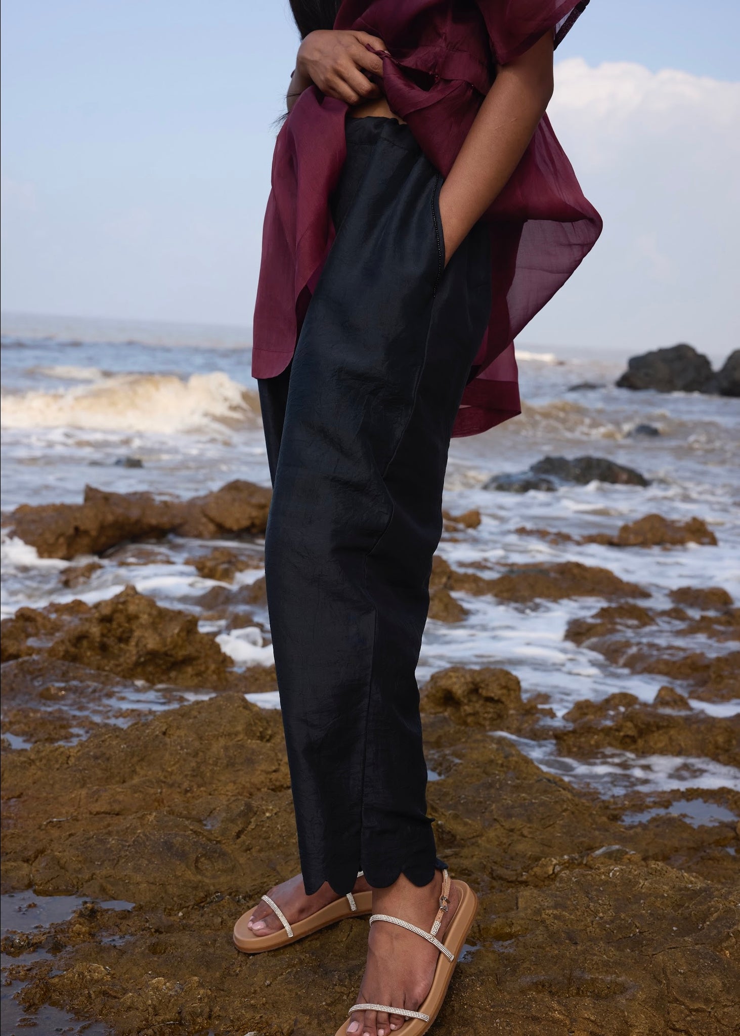A fresh take on our staple 'Brooke' pants that are simply dressy pyjamas. Oversized but elegantly cut in handwoven mulberry silk, fastened at the waist with a drawstring for a complete comfort fit. The pants are elevated with a scalloped hem and beaded details on the drawstring. These pants comes lined with soft cotton mul.