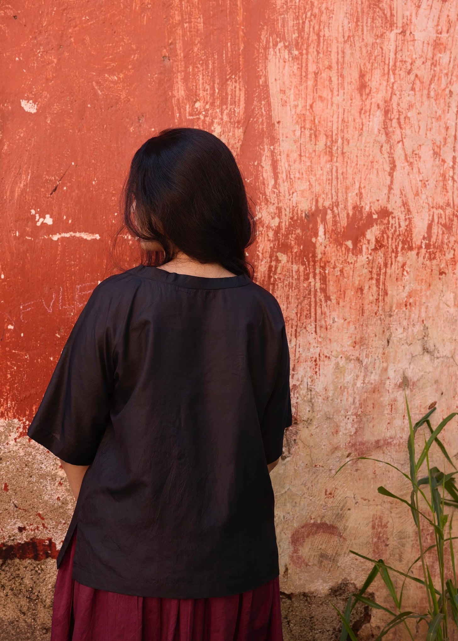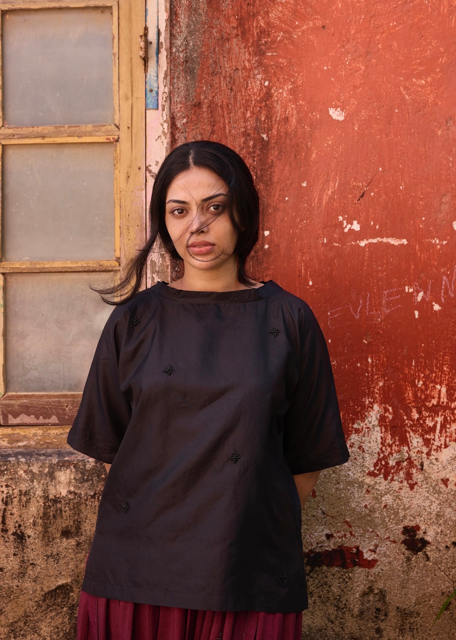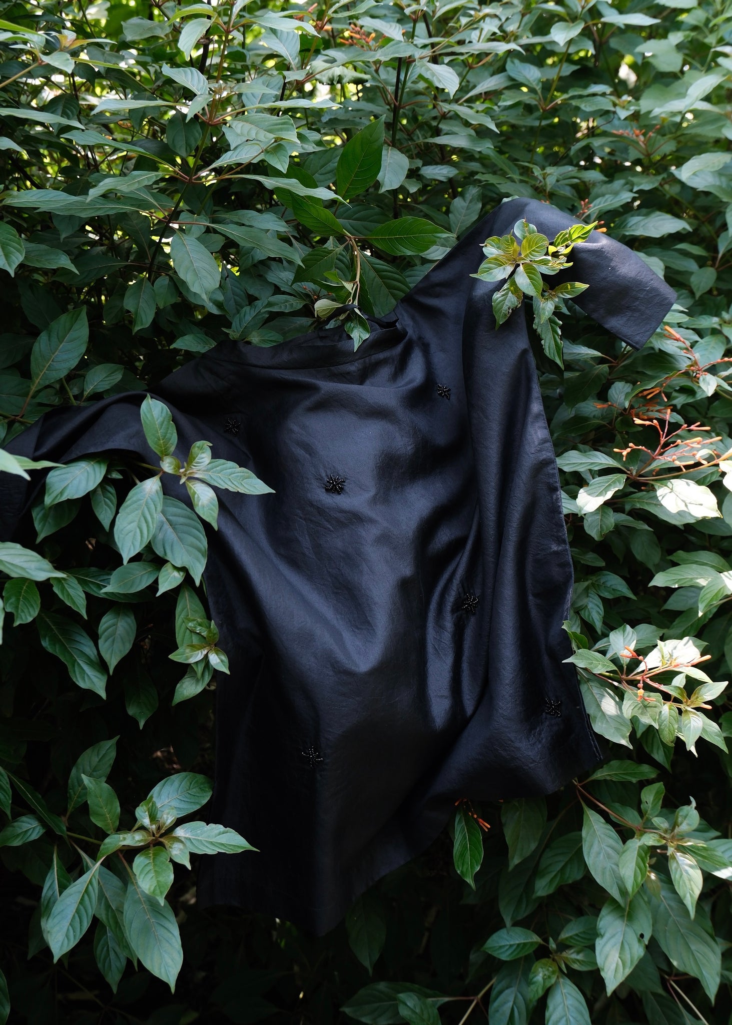 'Irene' is a take on our staple 'Ivy' box fit top. This time around with a little bit of surface ornamentation for the holiday season. The top is cut in a handwoven mulberry silk