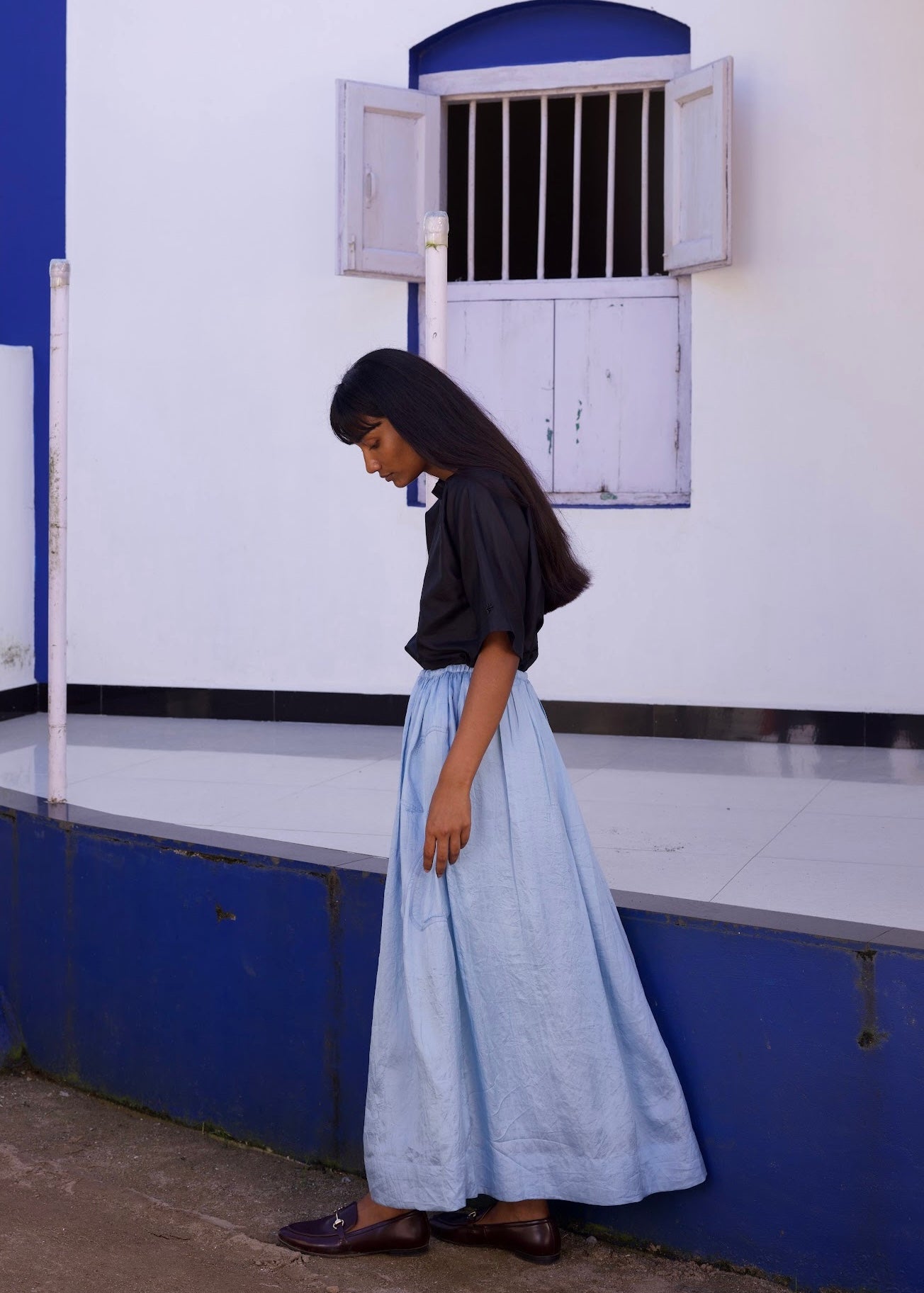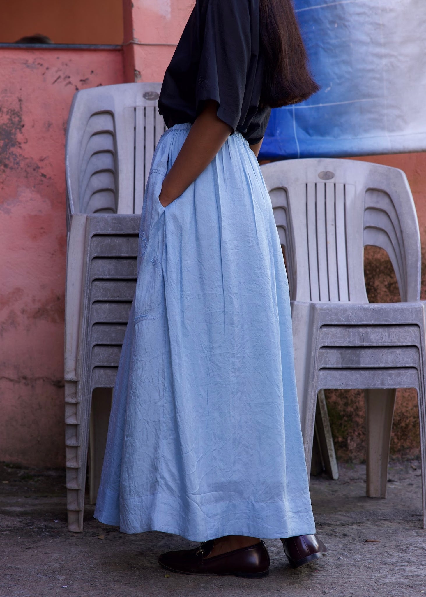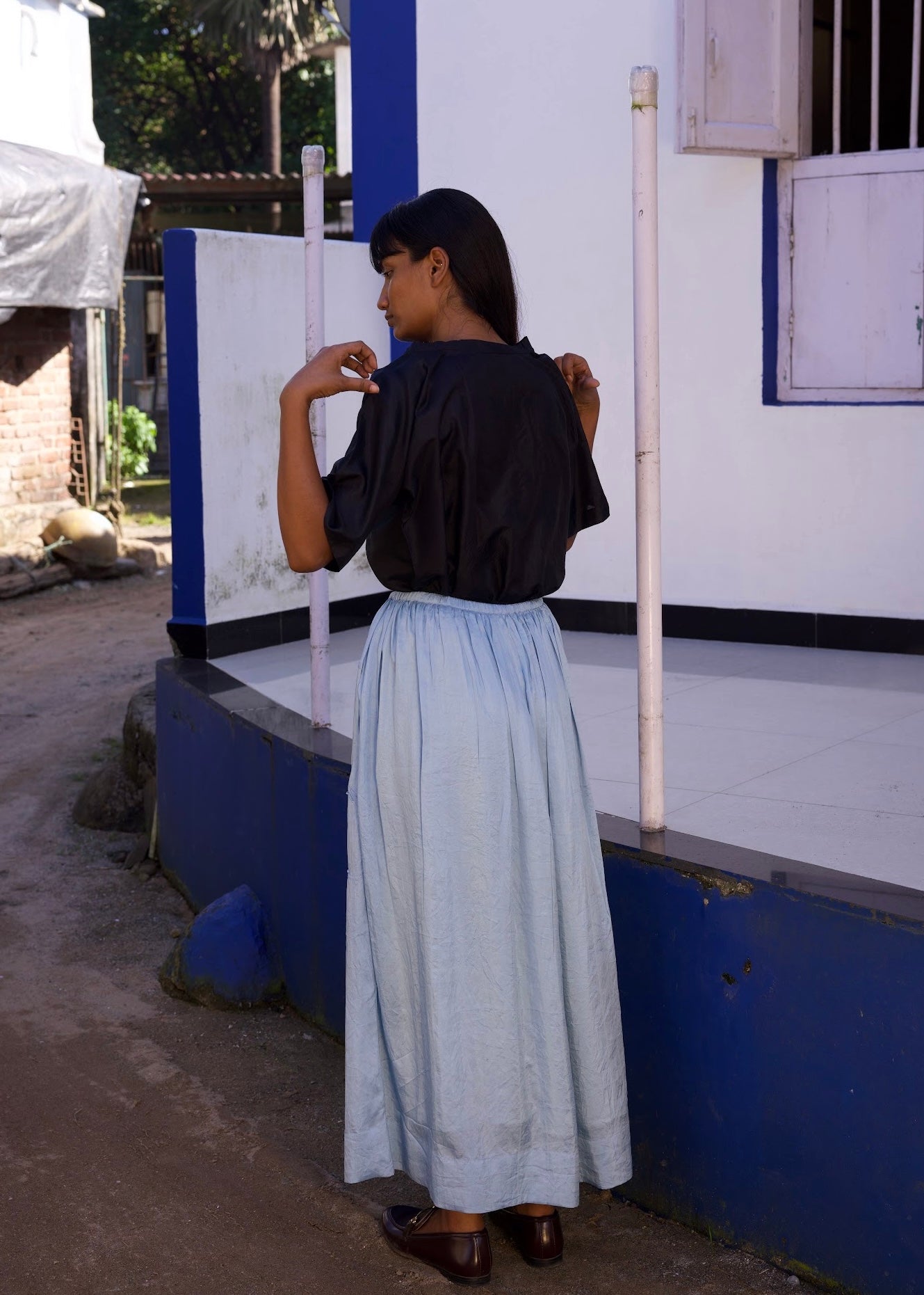 A simple handwoven mulberry silk skirt with light gathers, enhanced with abstract surface ornamentation using an applique technique and beadwork done by hand. The skirt has a fixed waistband on the front and elastic at the back and comes lined with soft cotton mul.