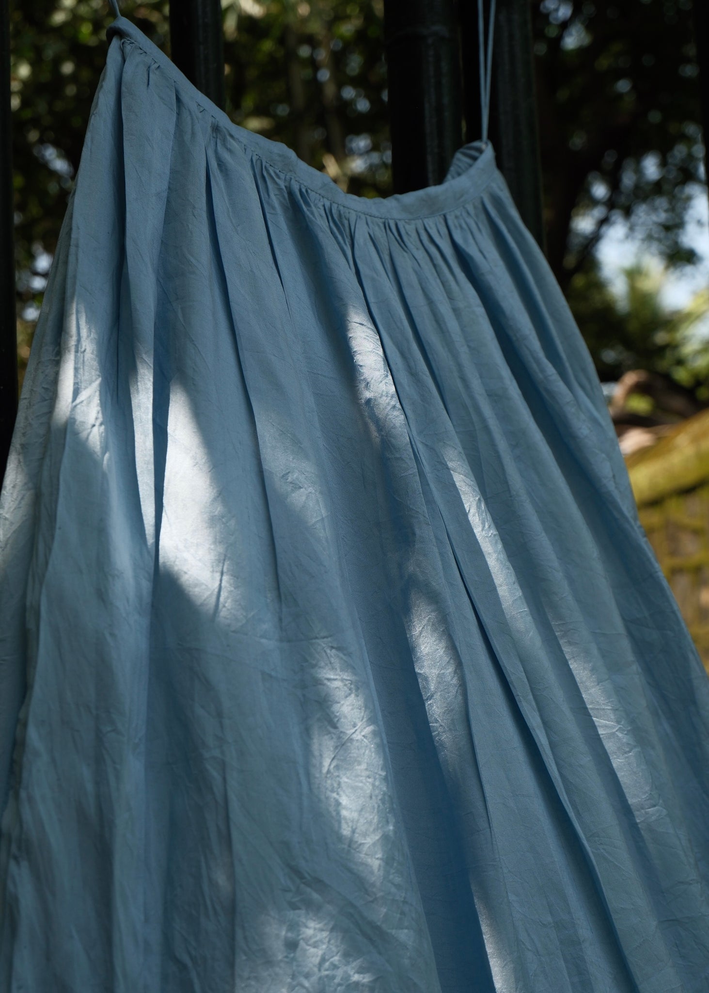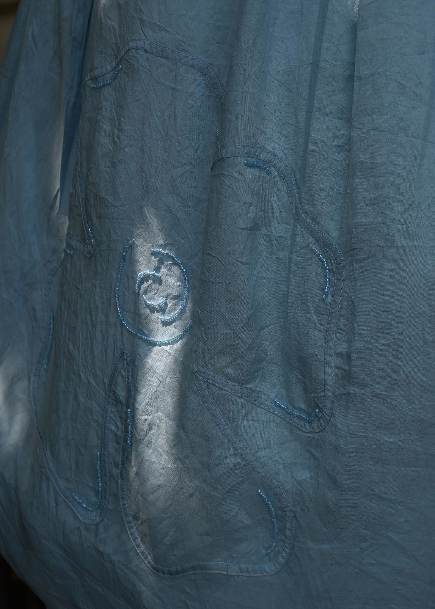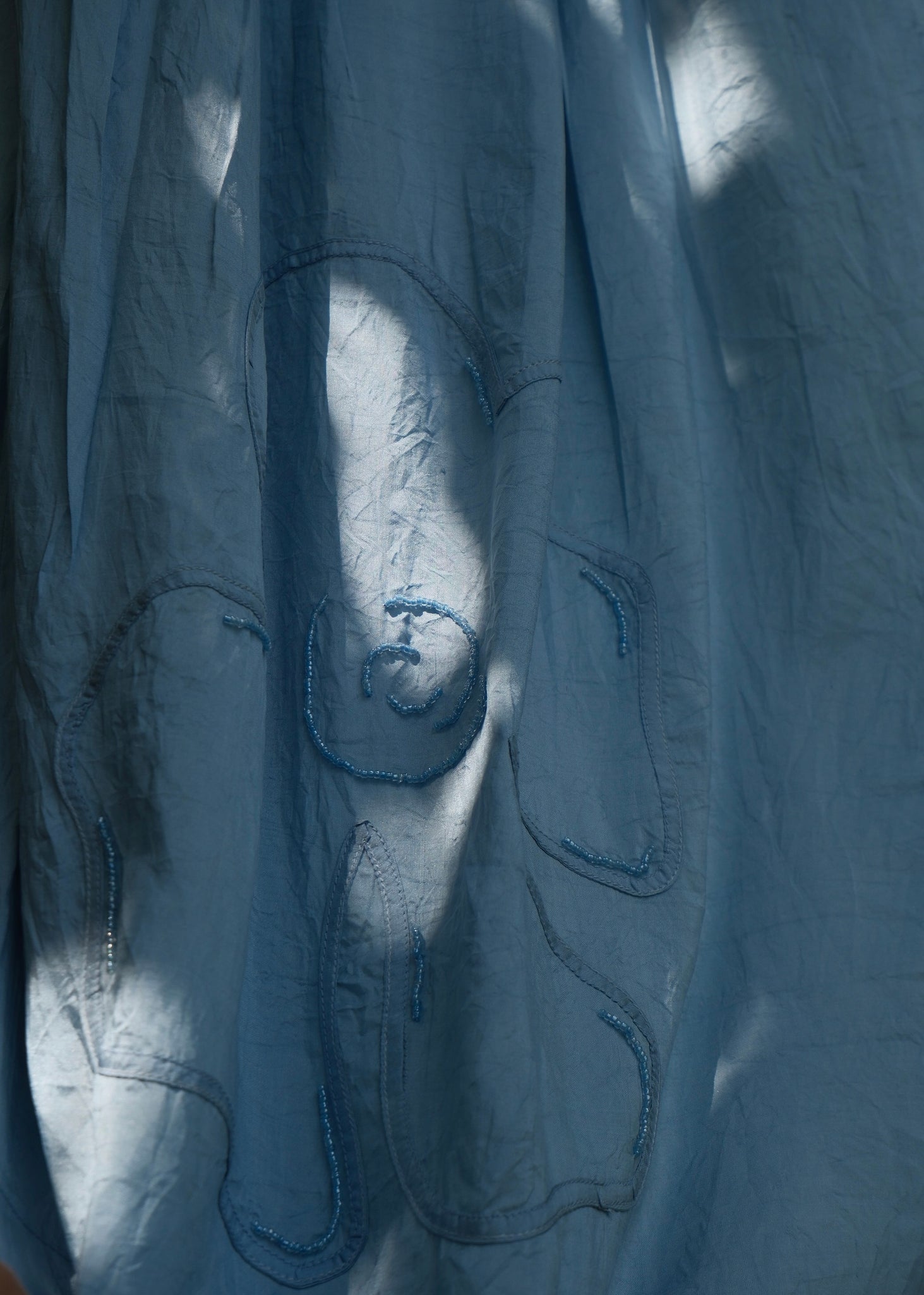 A simple handwoven mulberry silk skirt with light gathers, enhanced with abstract surface ornamentation using an applique technique and beadwork done by hand. The skirt has a fixed waistband on the front and elastic at the back and comes lined with soft cotton mul.
