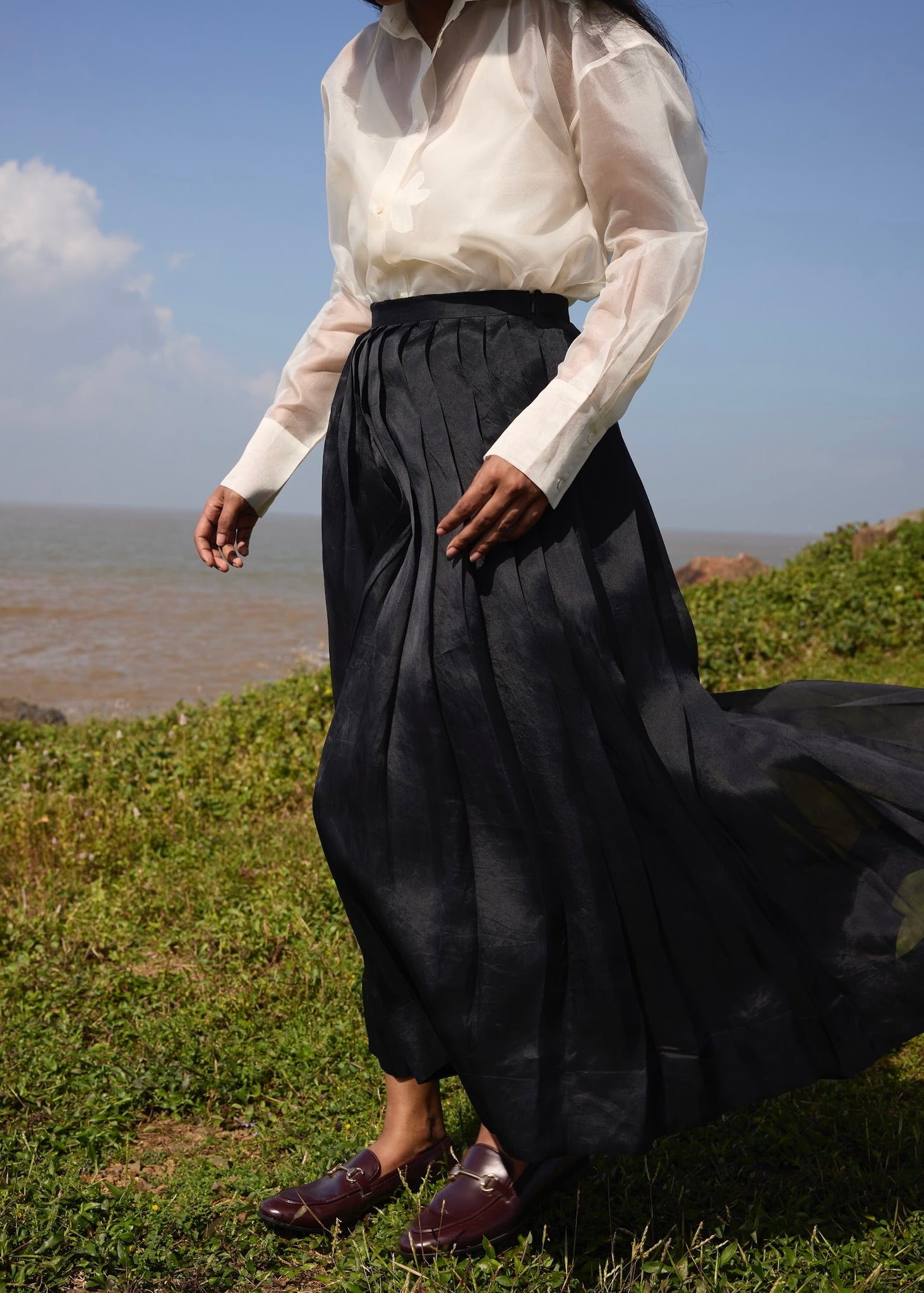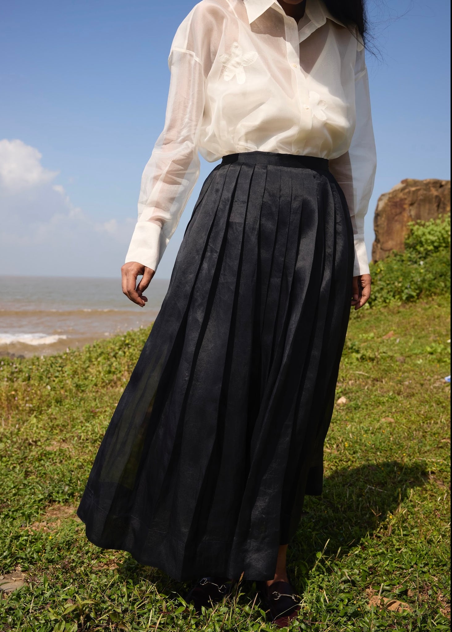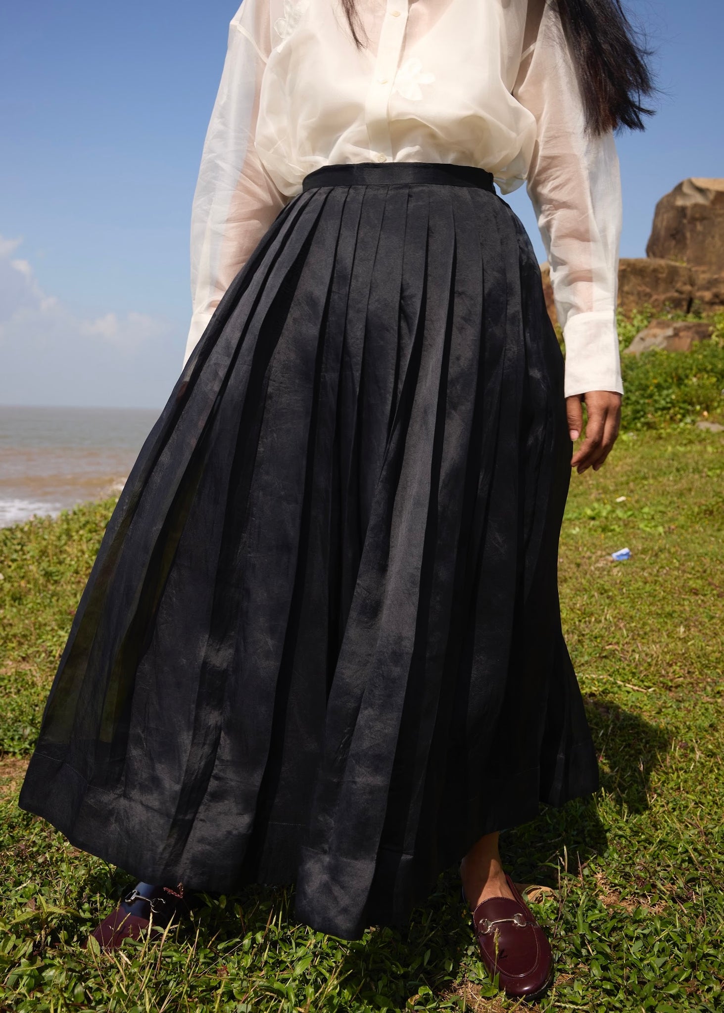 'Sydney', a classic knife pleated silk organza skirt with crisp pleats carefully set by hand. Fastened by a zip at the side, the skirt sits beautifully with it's flat waistband. Finished with a wide hem at the bottom, the skirt is elegant and a versatile wardrobe staple.