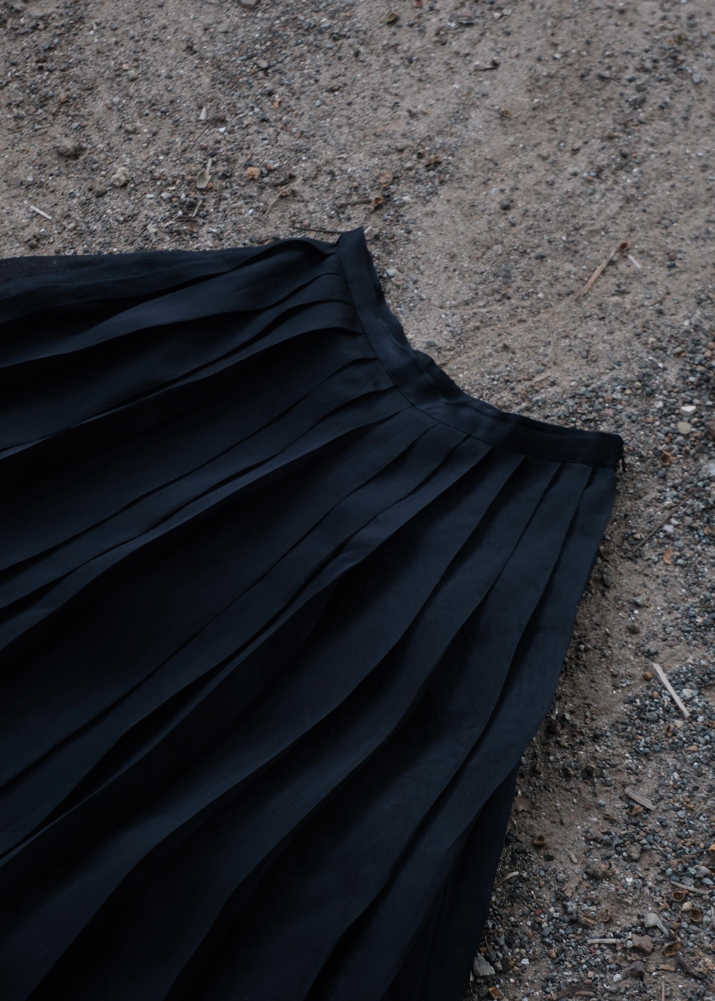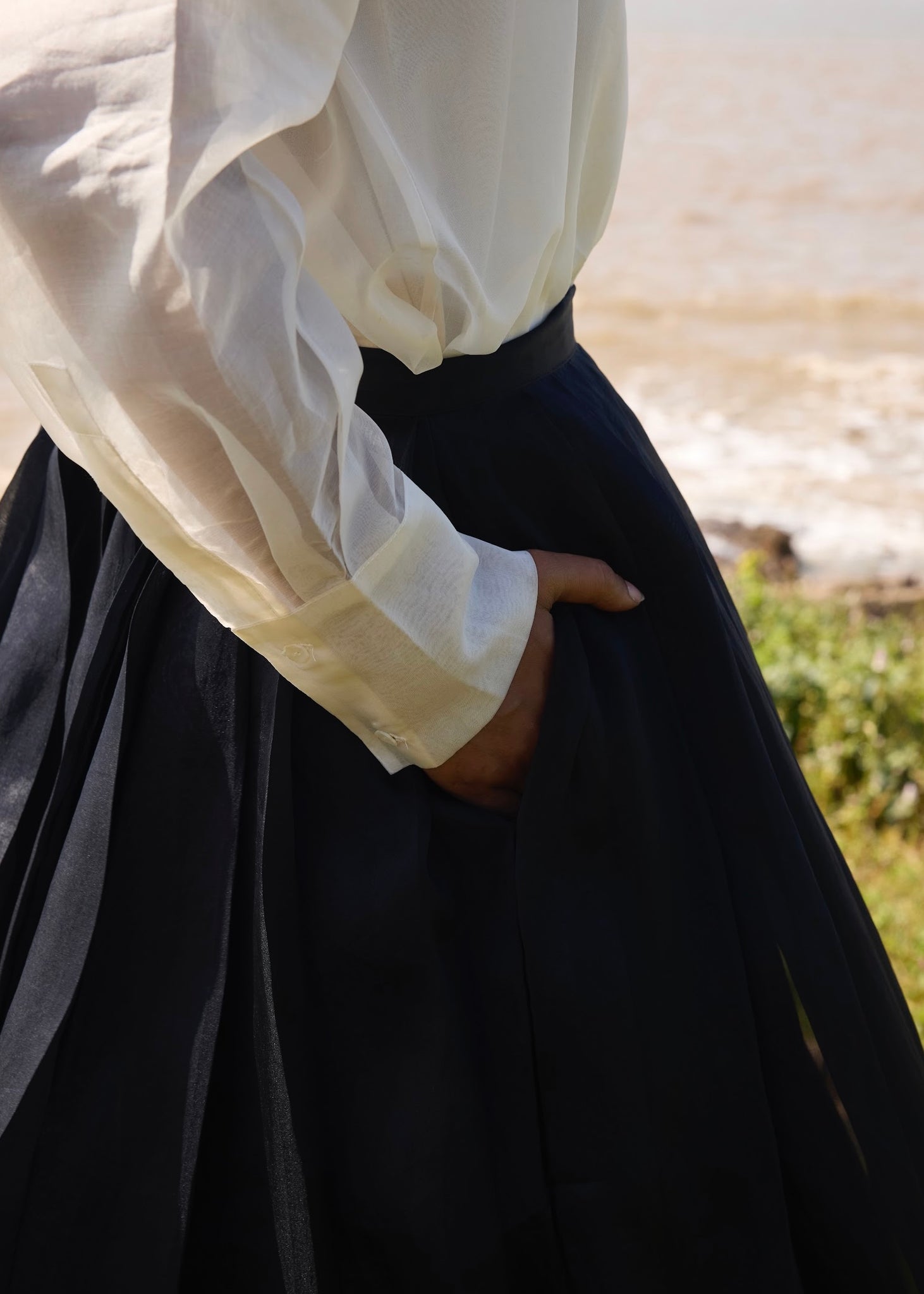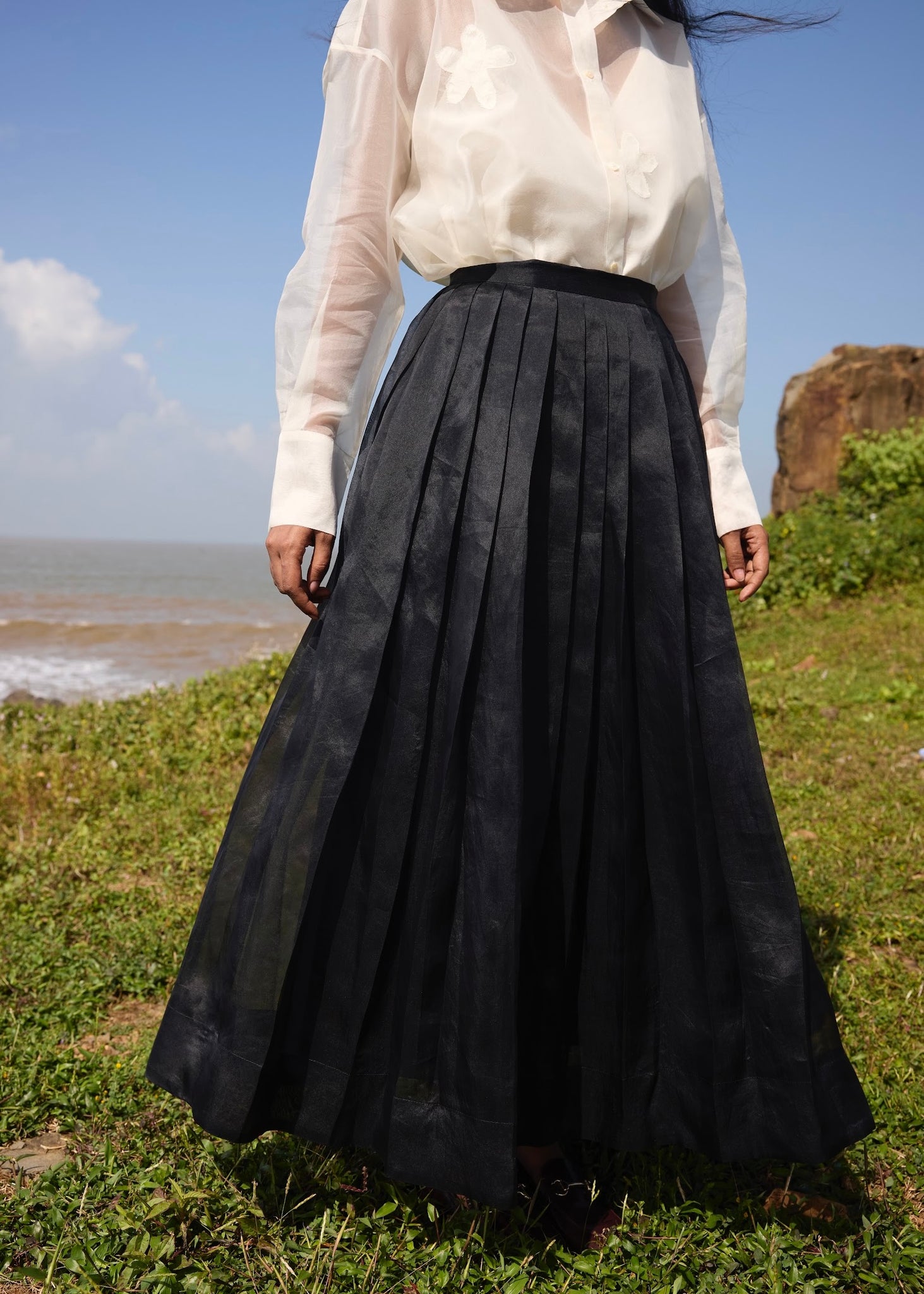'Sydney', a classic knife pleated silk organza skirt with crisp pleats carefully set by hand. Fastened by a zip at the side, the skirt sits beautifully with it's flat waistband. Finished with a wide hem at the bottom, the skirt is elegant and a versatile wardrobe staple.