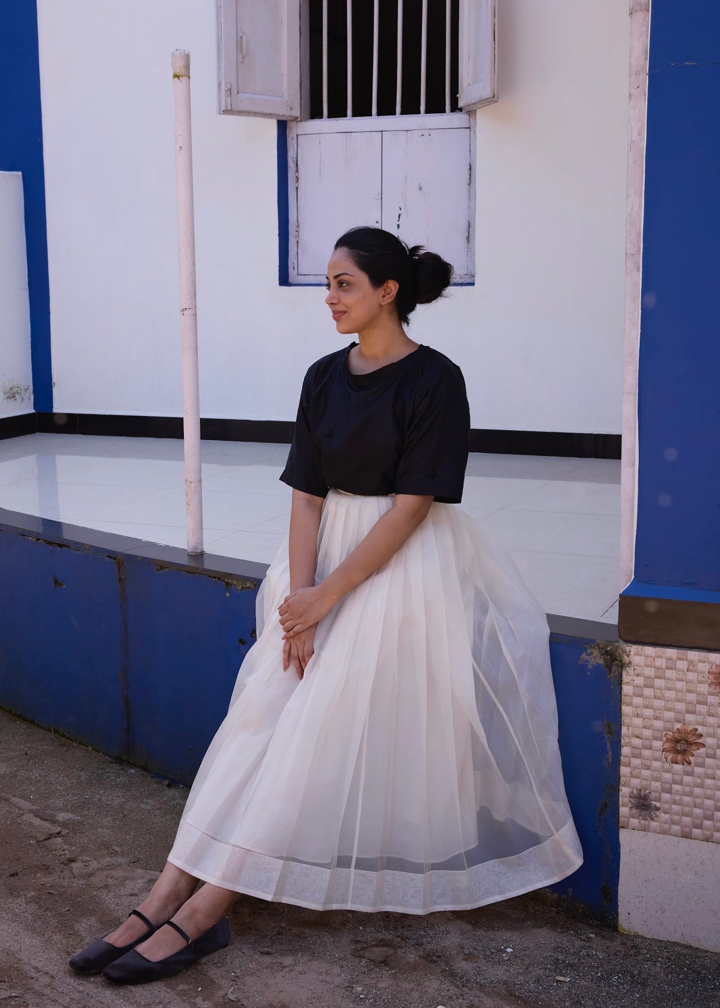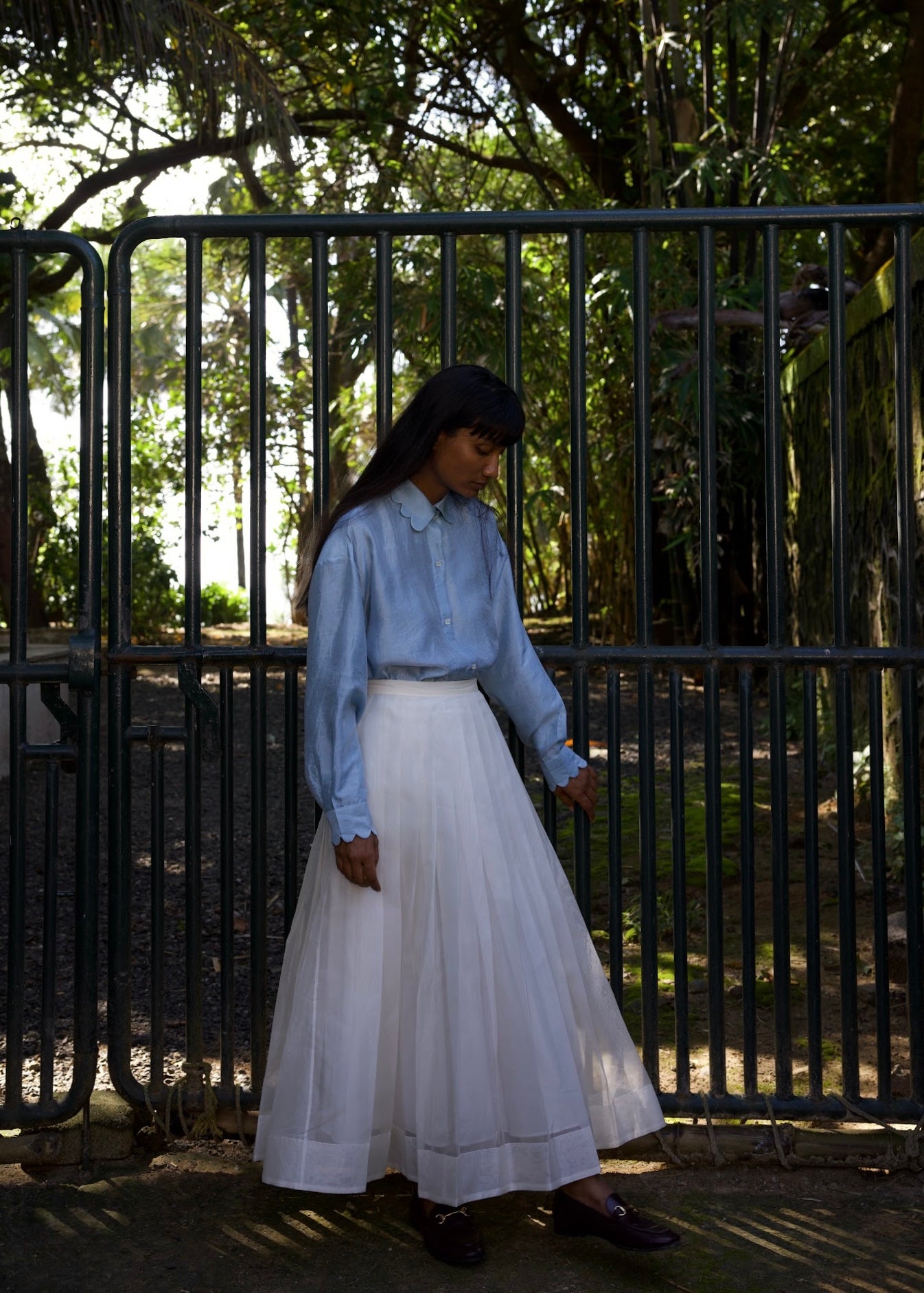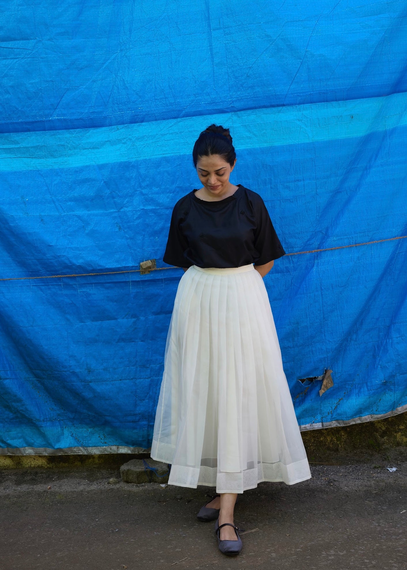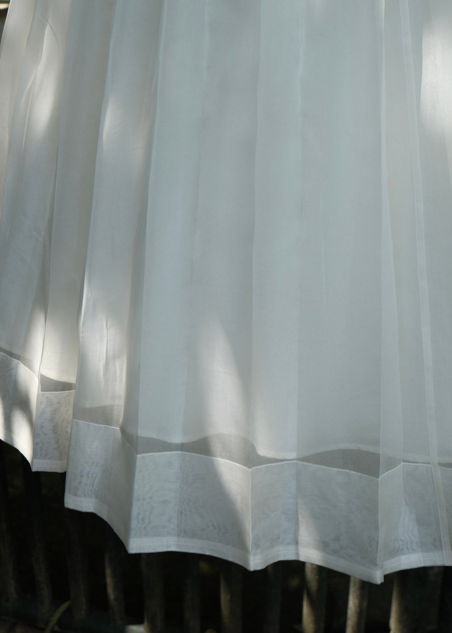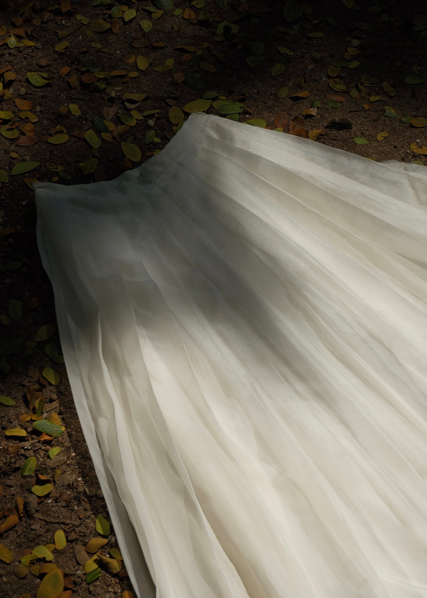 'Sydney', a classic knife pleated silk organza skirt with crisp pleats carefully set by hand. Fastened by a zip at the side, the skirt sits beautifully with it's flat waistband. Finished with a wide hem at the bottom, the skirt is elegant and a versatile wardrobe staple.