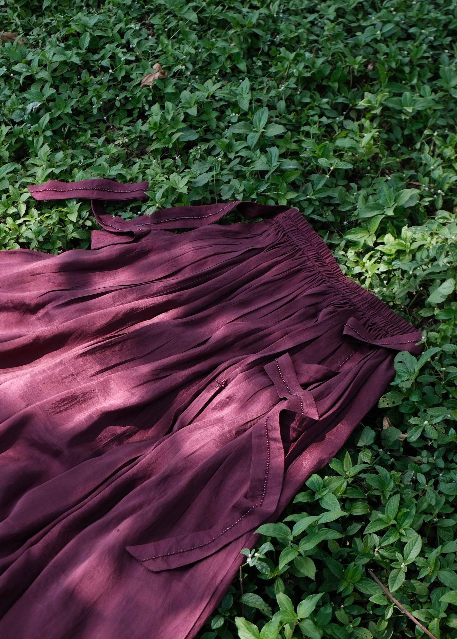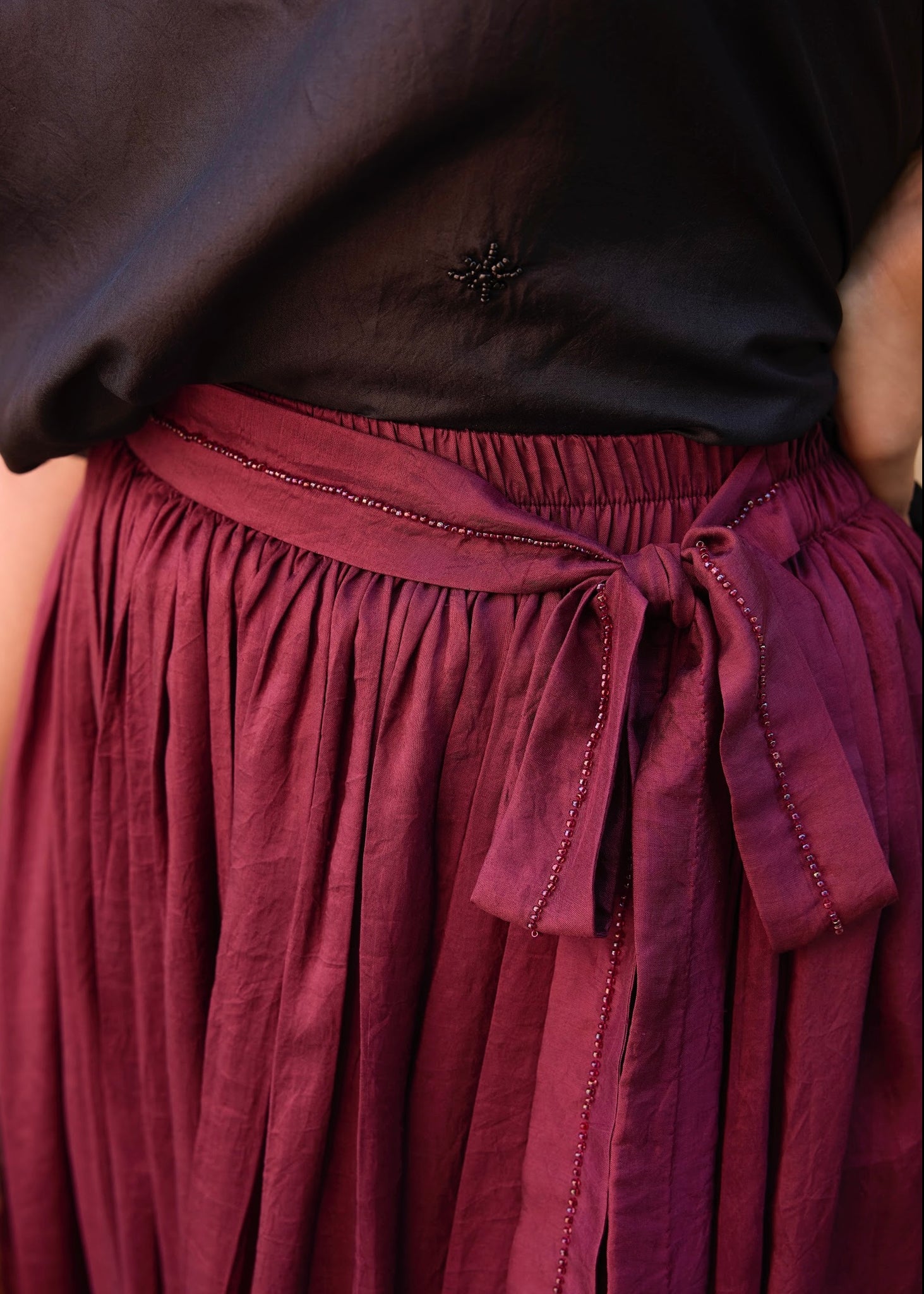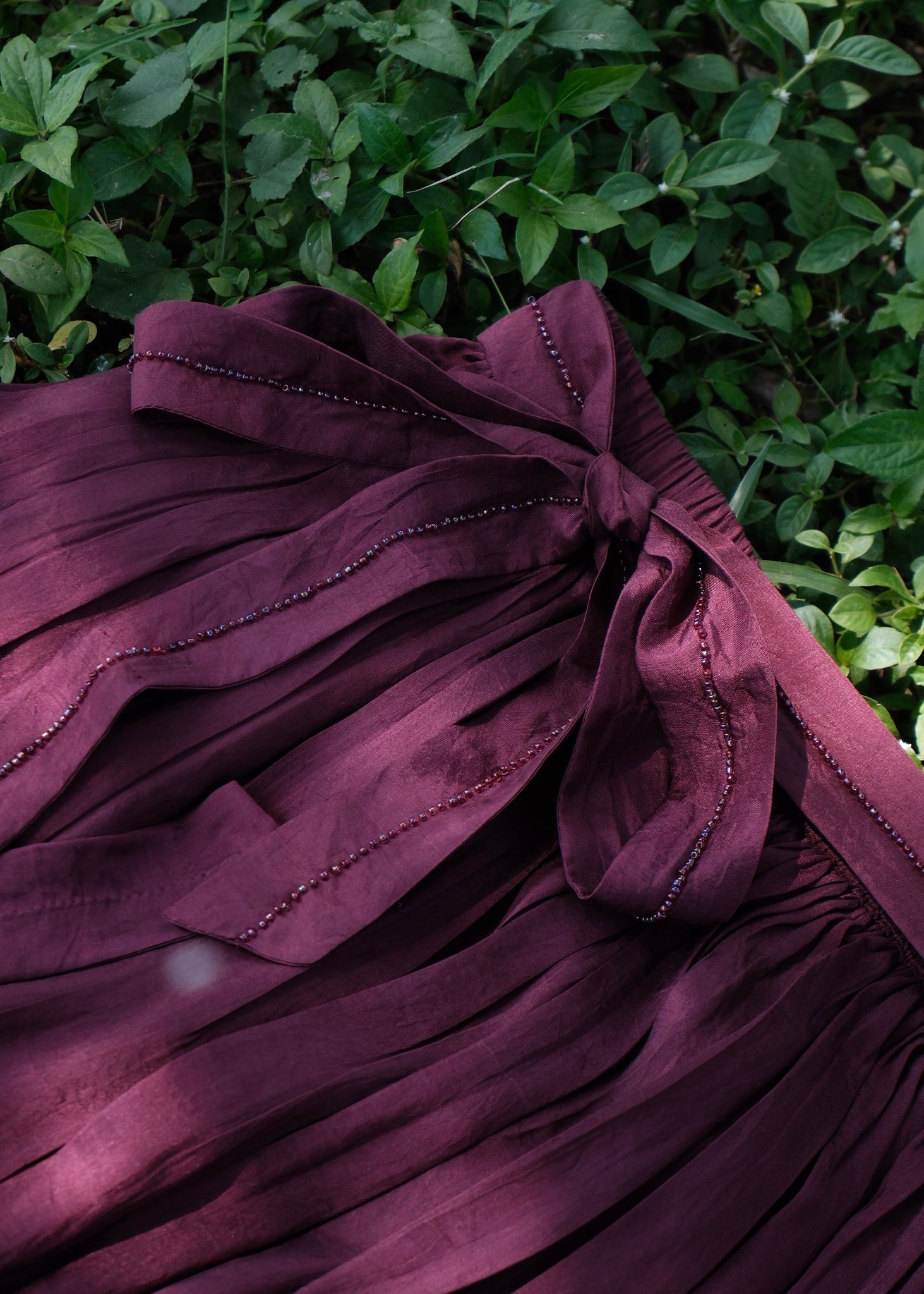 Crafted from handwoven silk, this piece features an elasticated front band that serves with an attached belt, highlighted by delicate beadwork. The look elevates as it features glass bead embroidery, that offers a distinctly festive and elegant look.