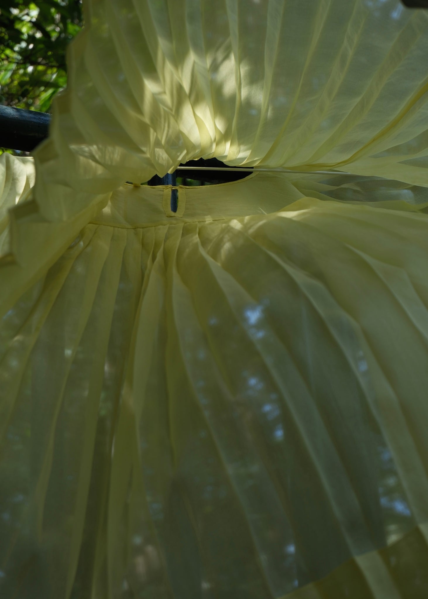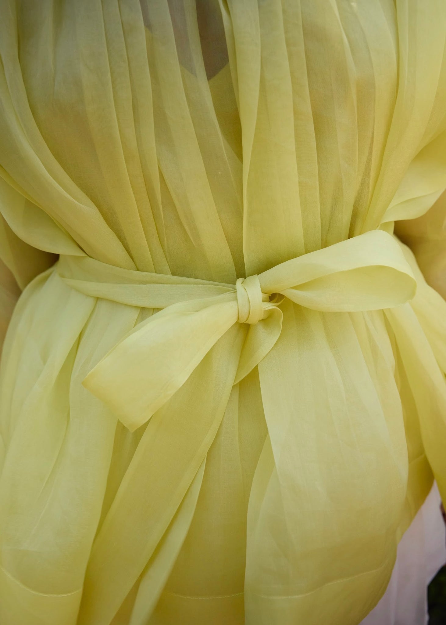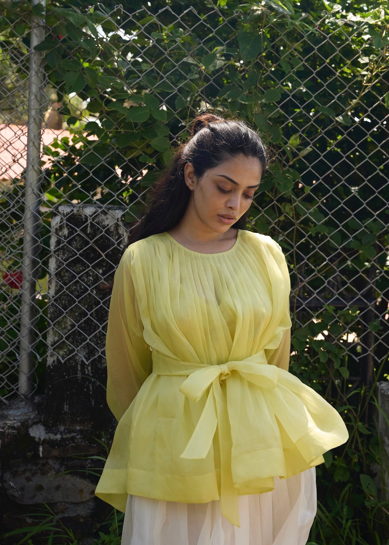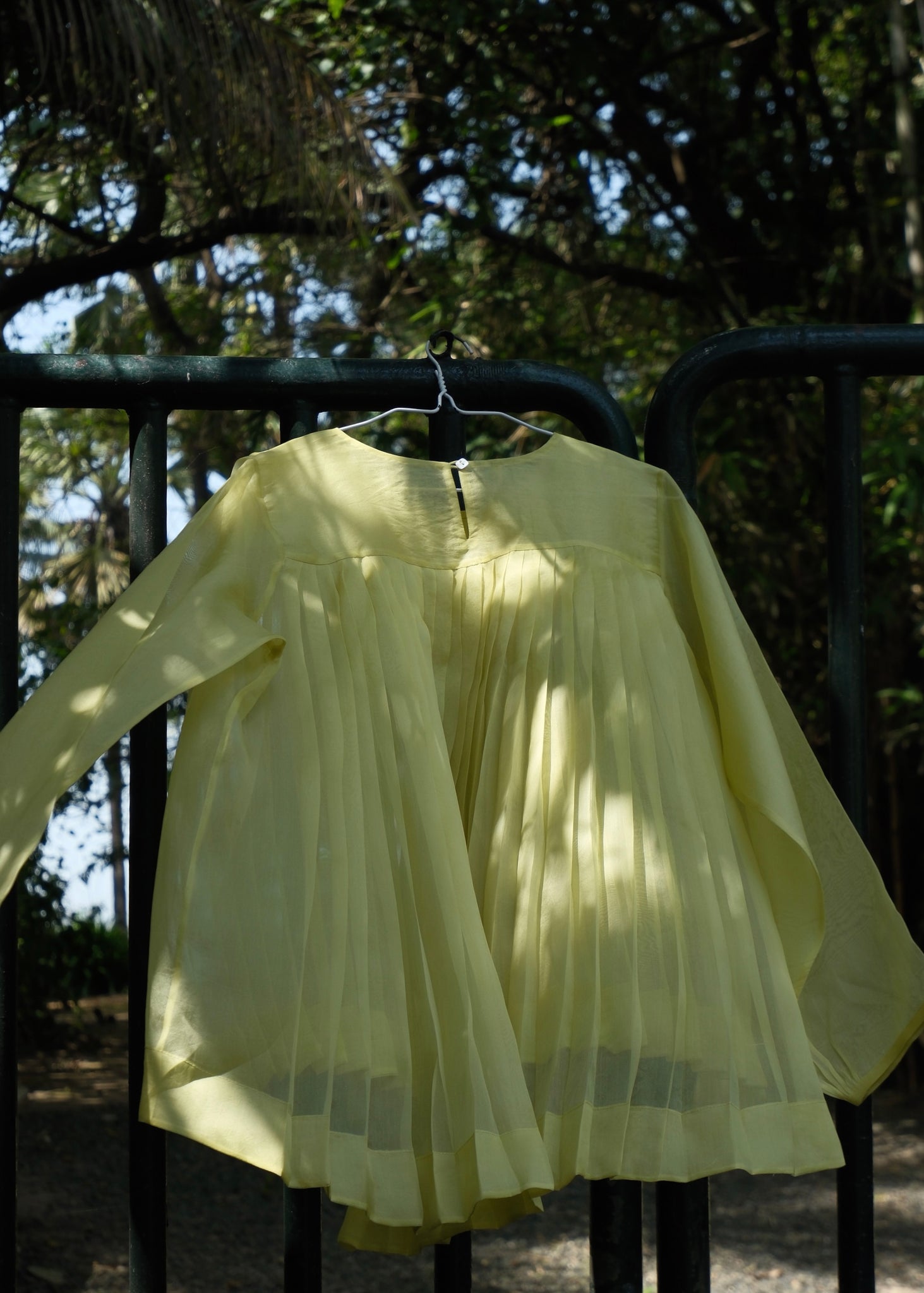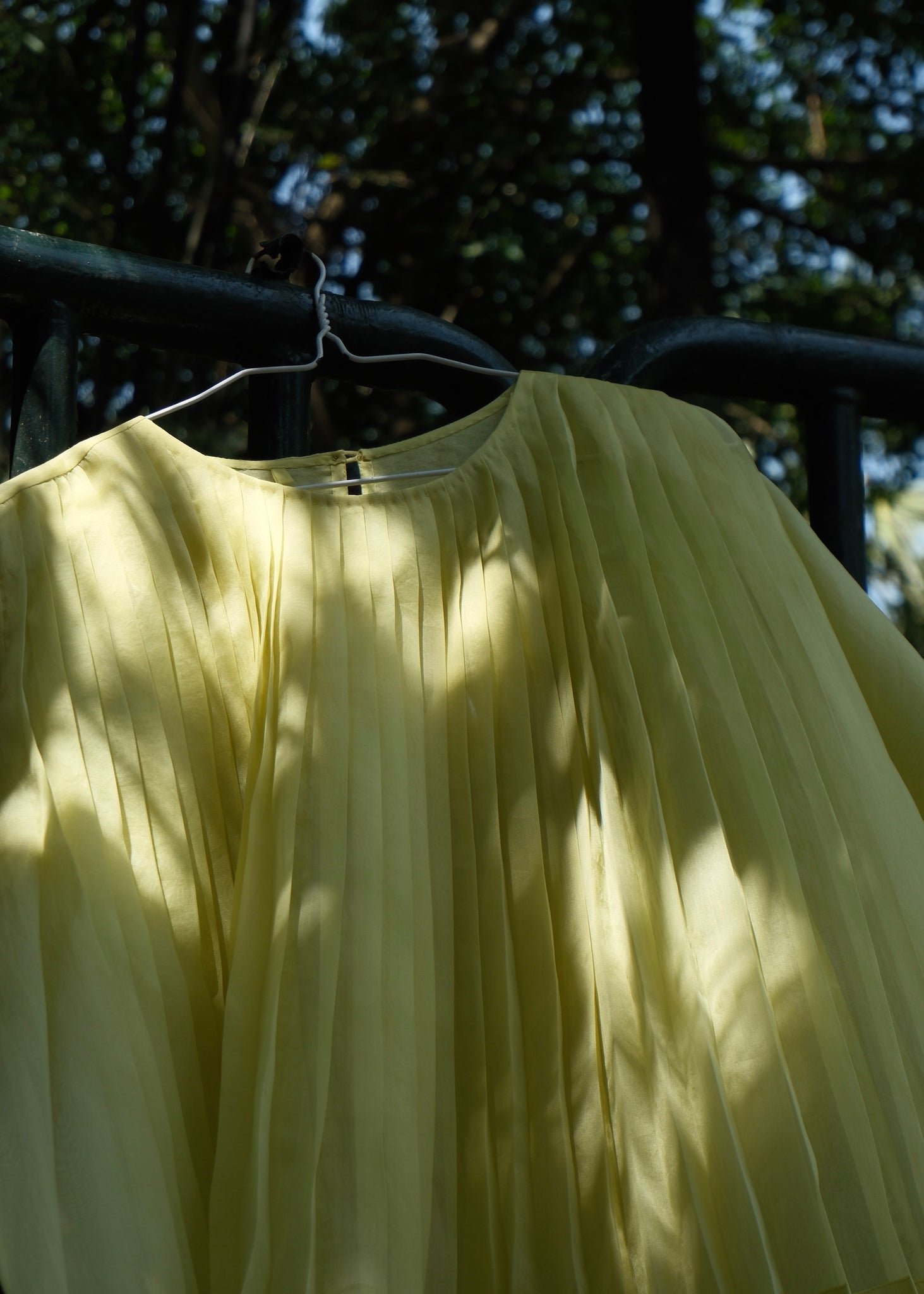 'Avril' is a playful closed round neck top with carefully placed knife pleats that run down from the neck to the hem. Each pleat is meticulously marked ensuring an even all around fall and structure. The top comes with a thick belt for versatility as well as a cotton slip as seen in the photographs.