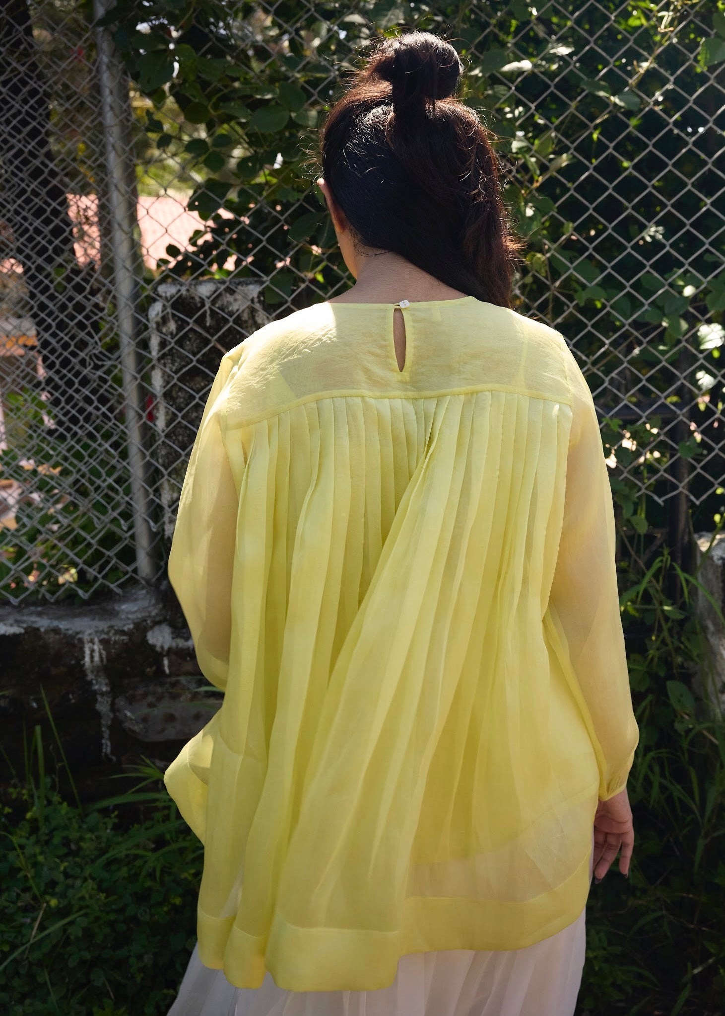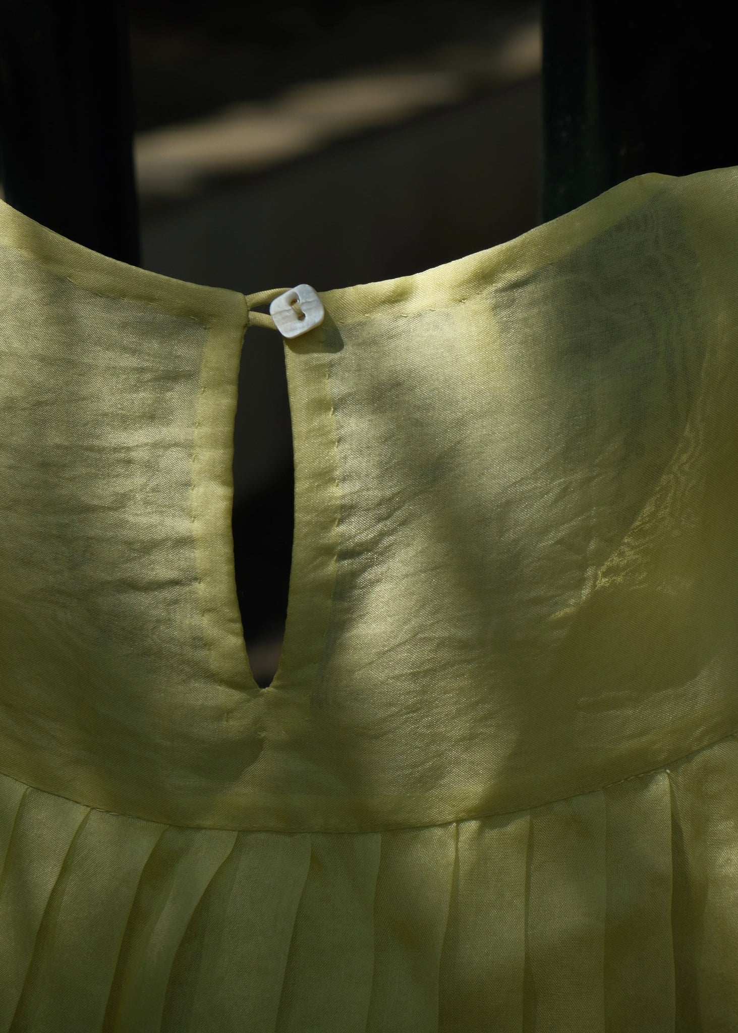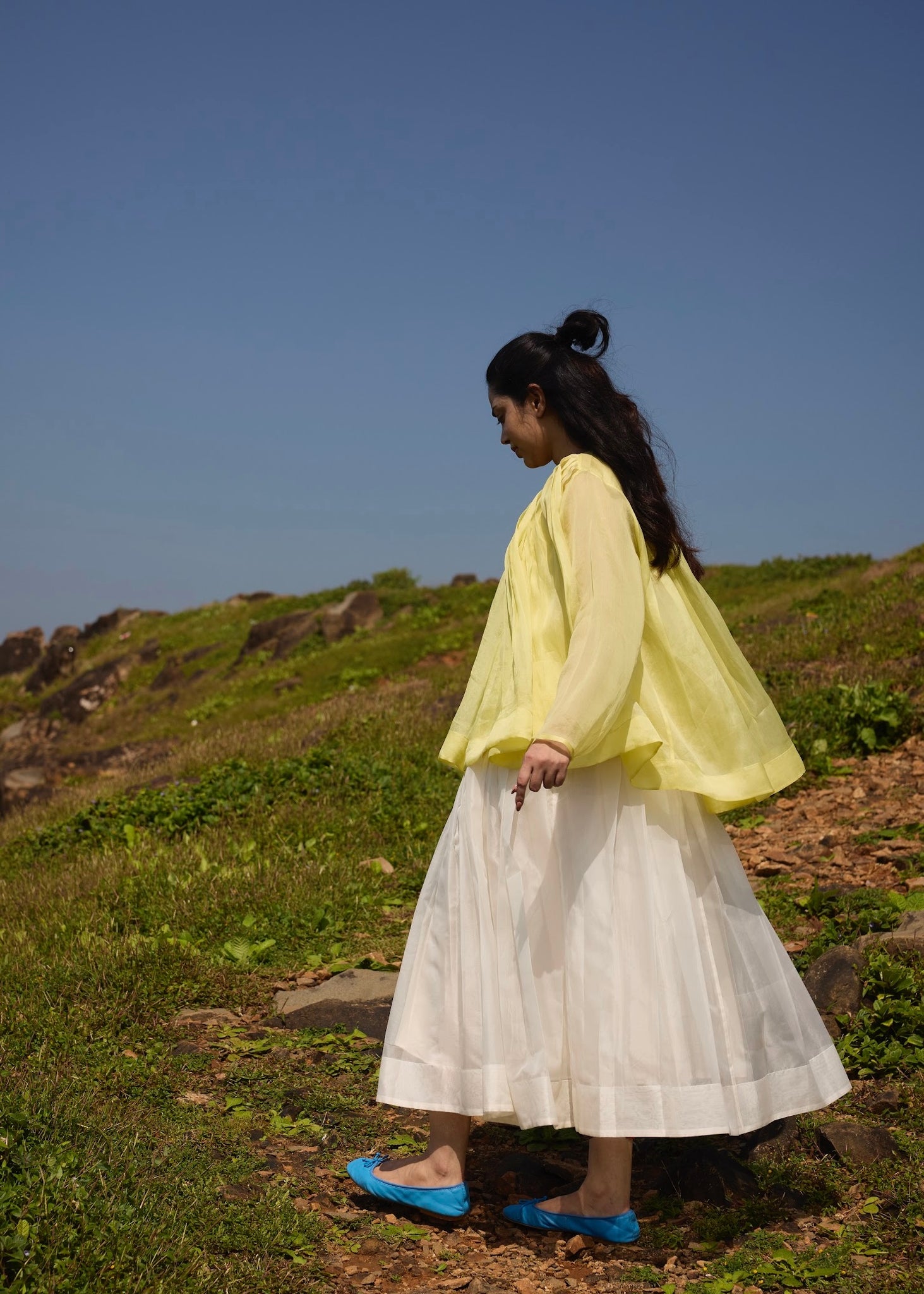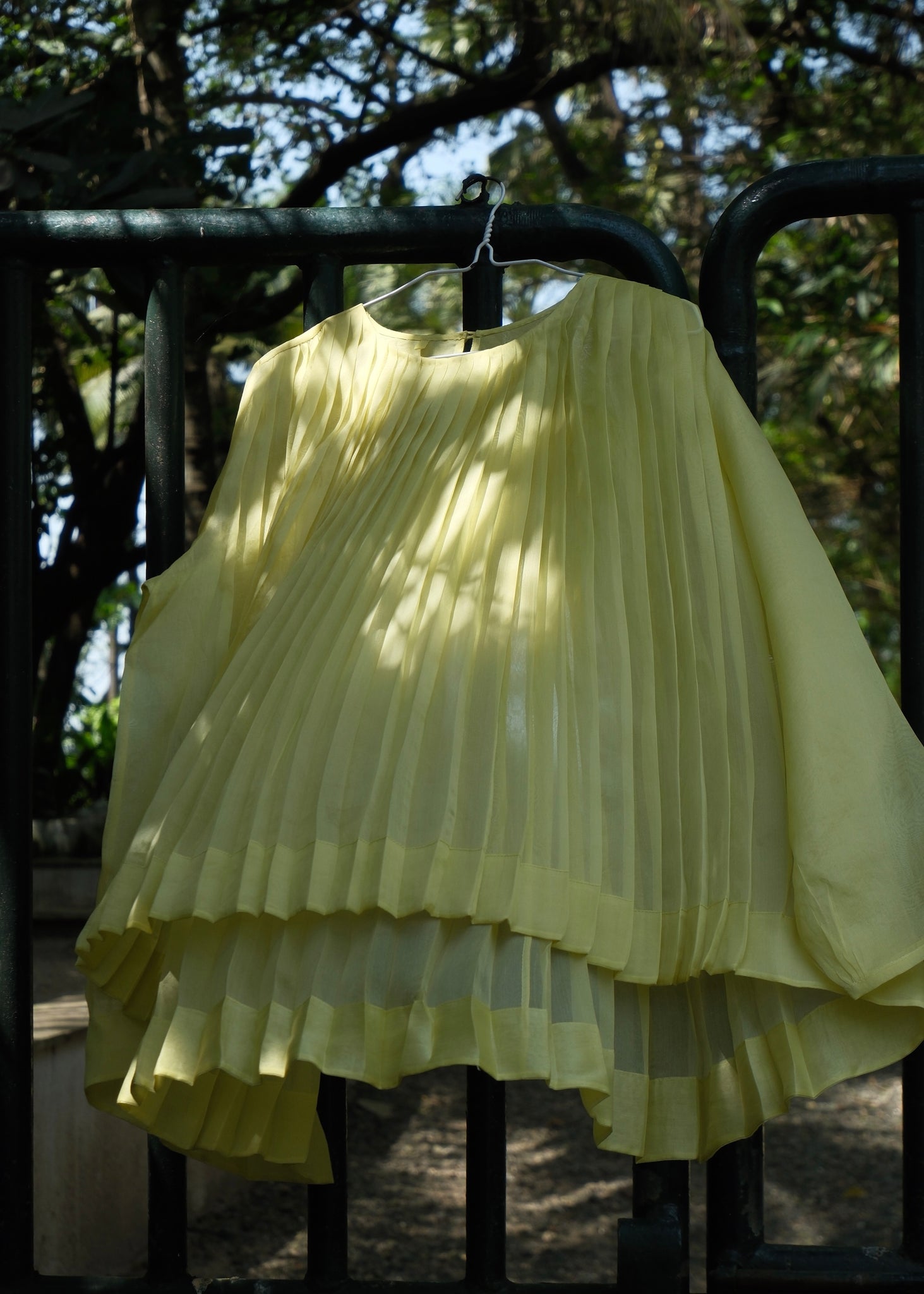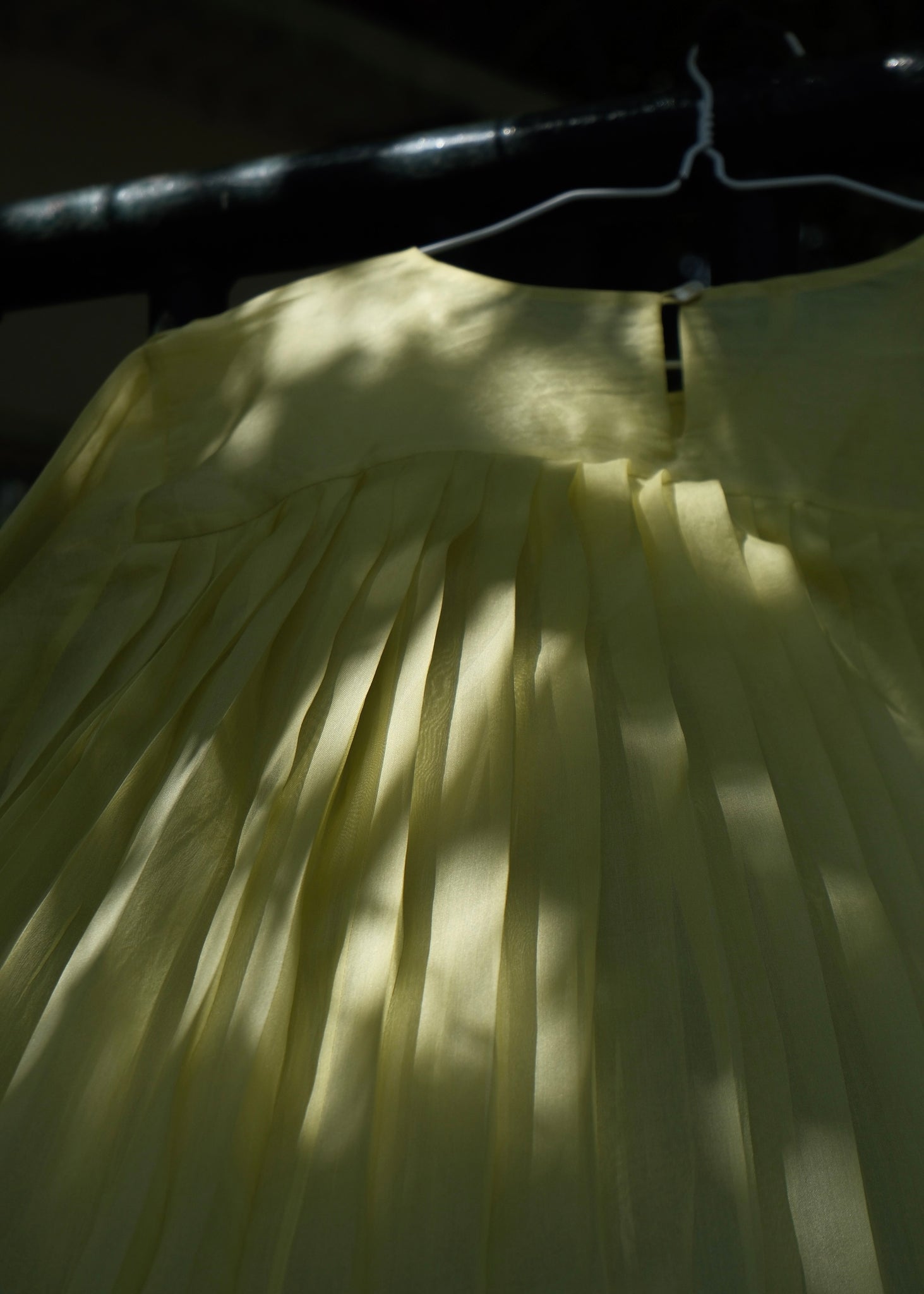 'Avril' is a playful closed round neck top with carefully placed knife pleats that run down from the neck to the hem. Each pleat is meticulously marked ensuring an even all around fall and structure. The top comes with a thick belt for versatility as well as a cotton slip as seen in the photographs.
